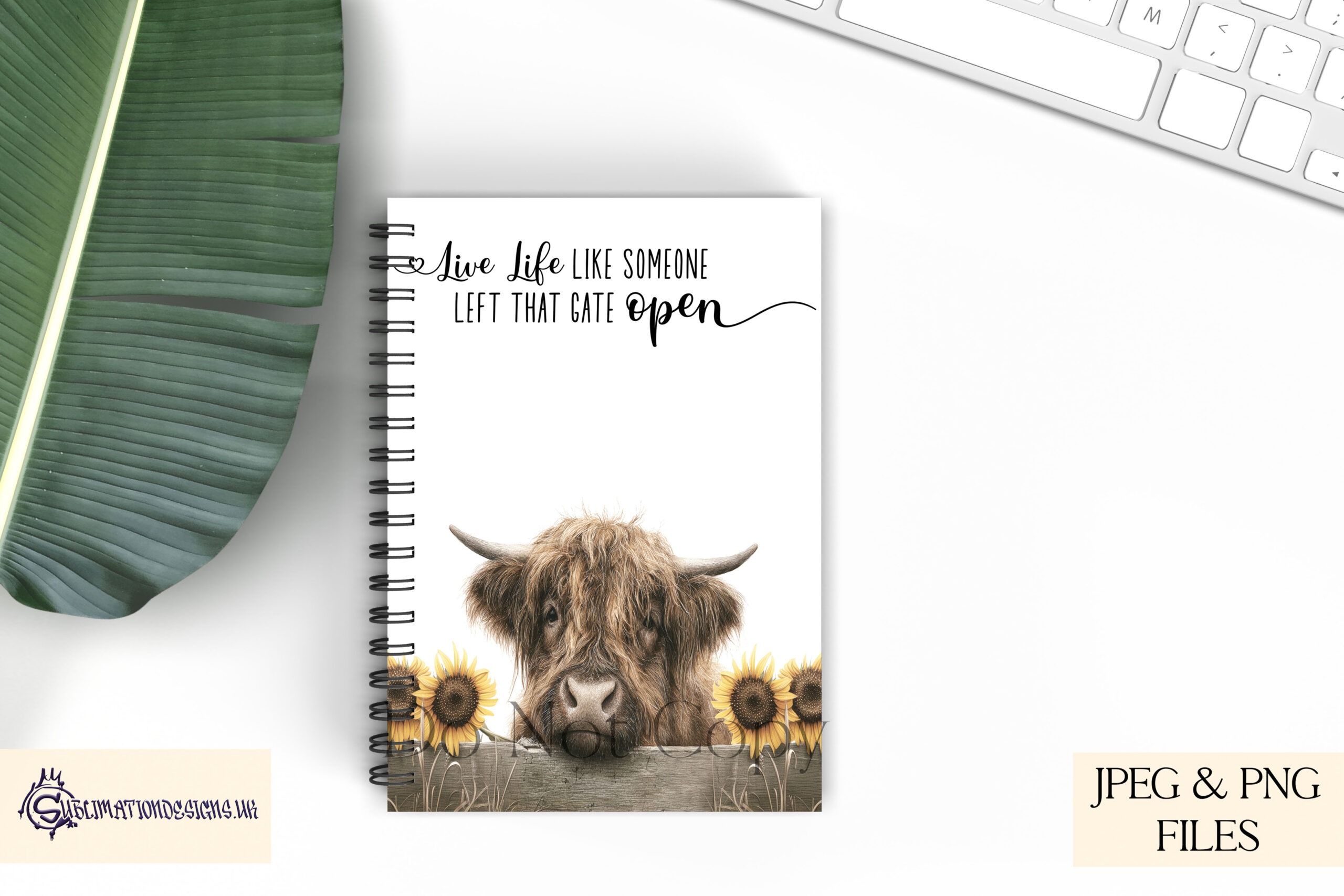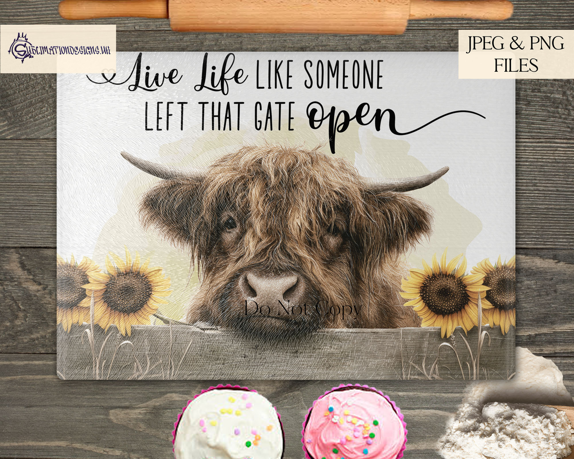 The Live Life Highland Cows Sunflower Field Set brings a warm and cheerful look to your handmade products. This version replaces the daisies with a field of vivid sunflowers, giving the artwork a sunny and positive feel. The wording Live Life Like Someone Left That Gate Open adds a gentle motivational message, and the textless versions give you the freedom to create your own personalised pieces.