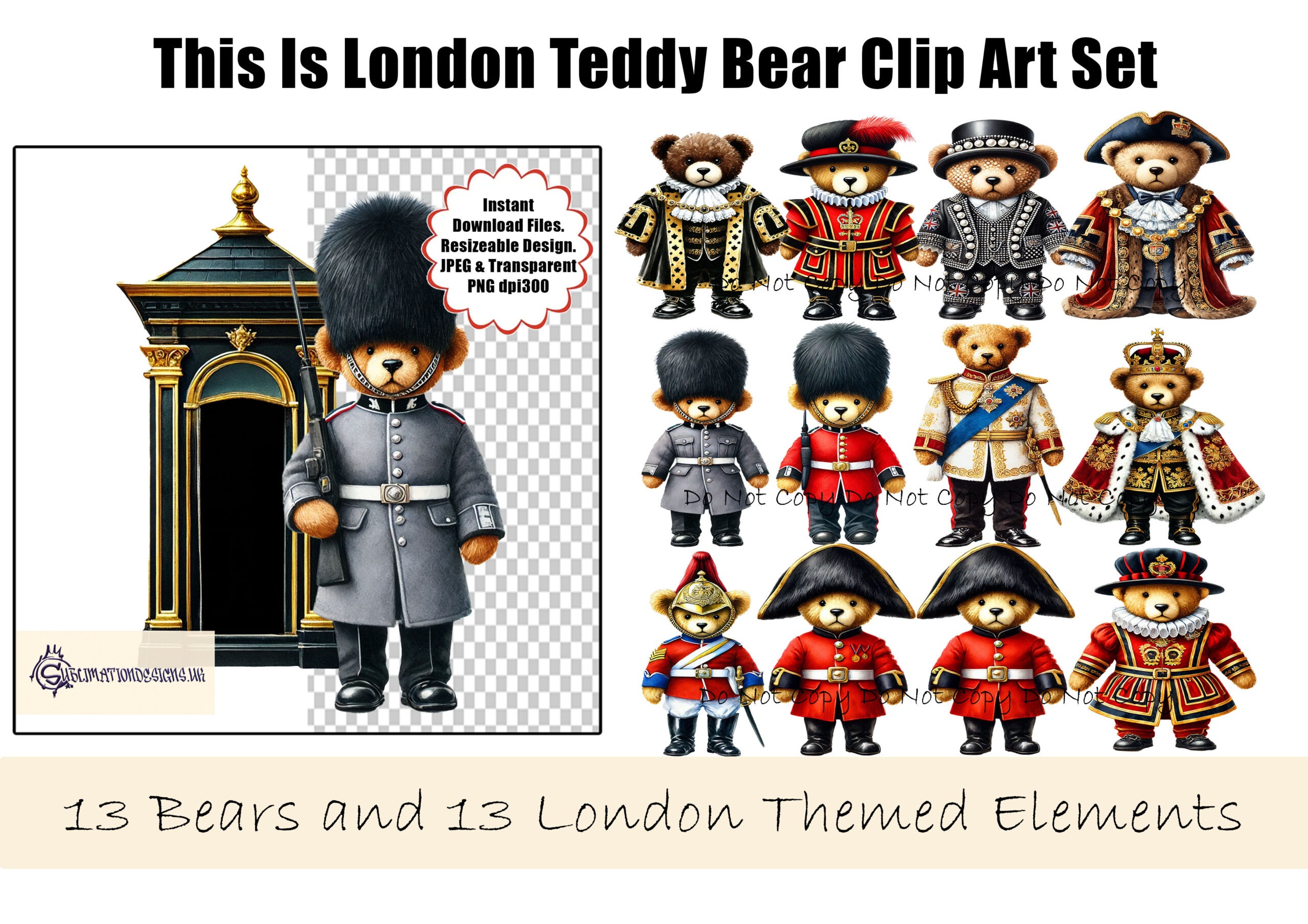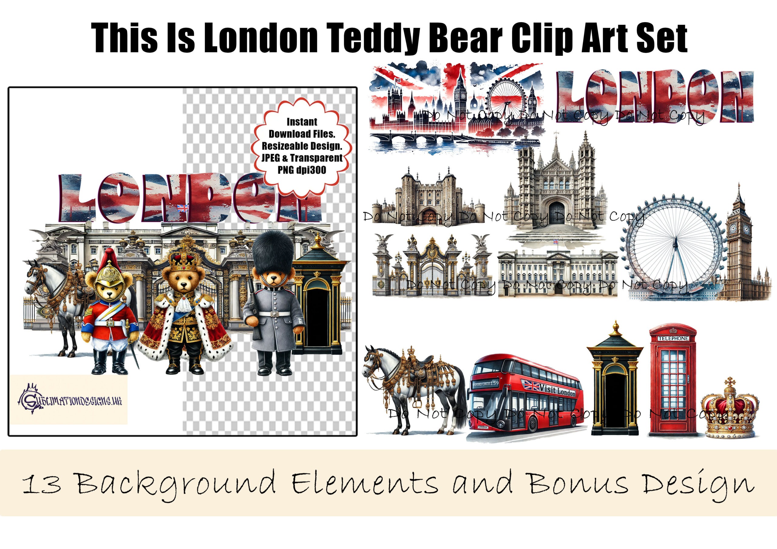A London-themed clip art set, featuring 13 teddy bears in iconic uniforms, plus 13 London landmarks and background elements. Includes a completed London design for easy sublimation use. Perfect for British souvenirs, travel gifts, and sublimation crafting. Comes in JPEG and PNG formats with four mock-ups included.