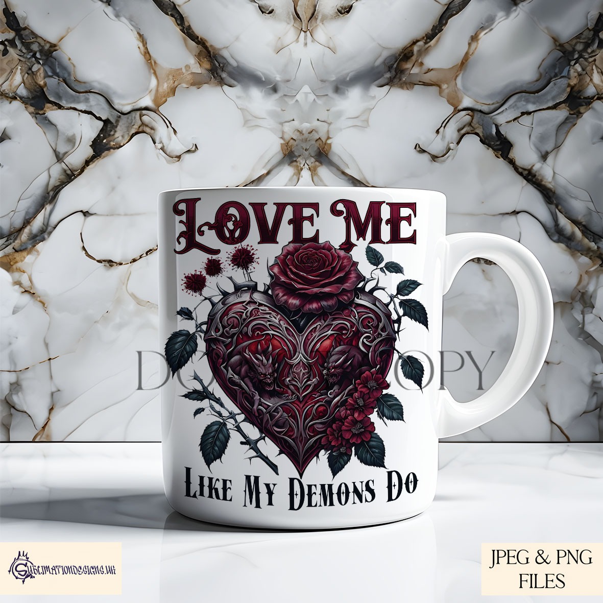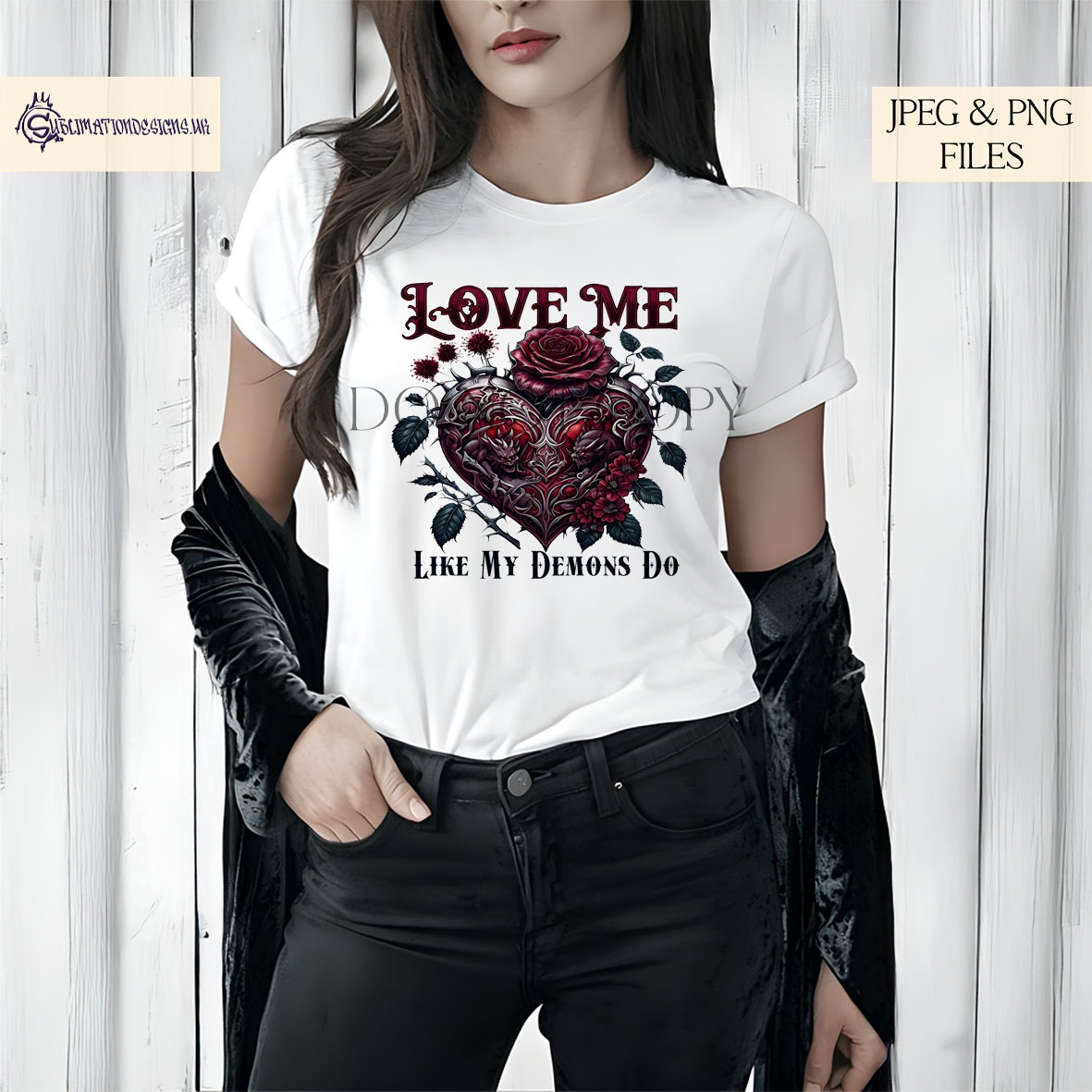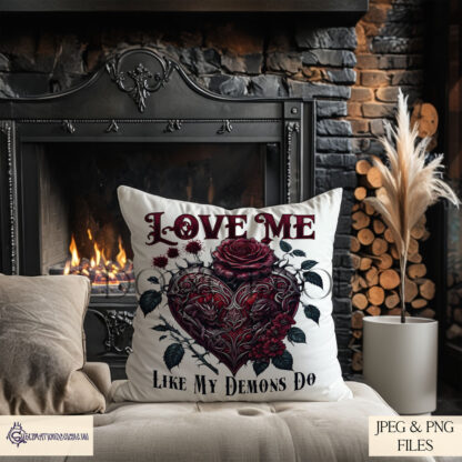 Step into the dark romance of our Gothic Collection with the Love Me Like My Demons Do design. This striking artwork features a gothic love heart filled with demons, wrapped in thorns and roses, creating a haunting yet passionate aesthetic.