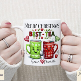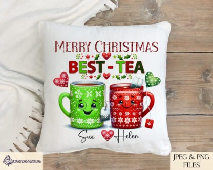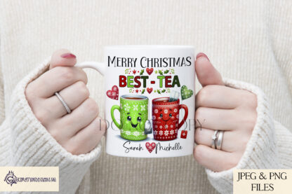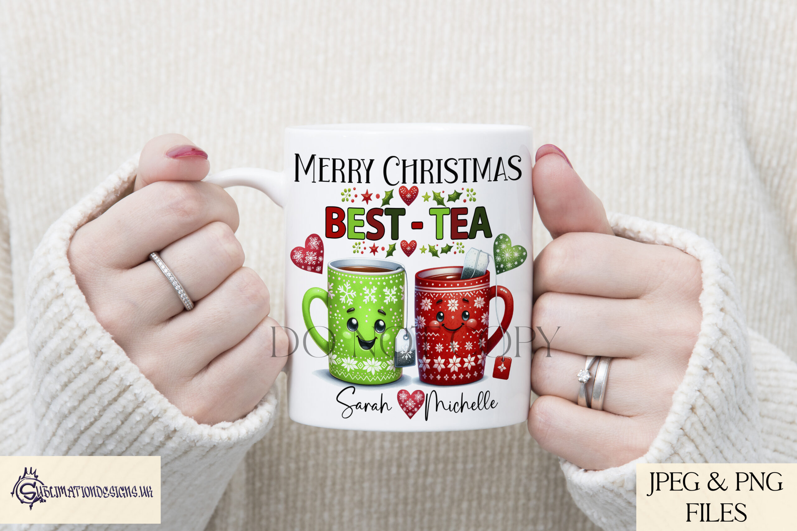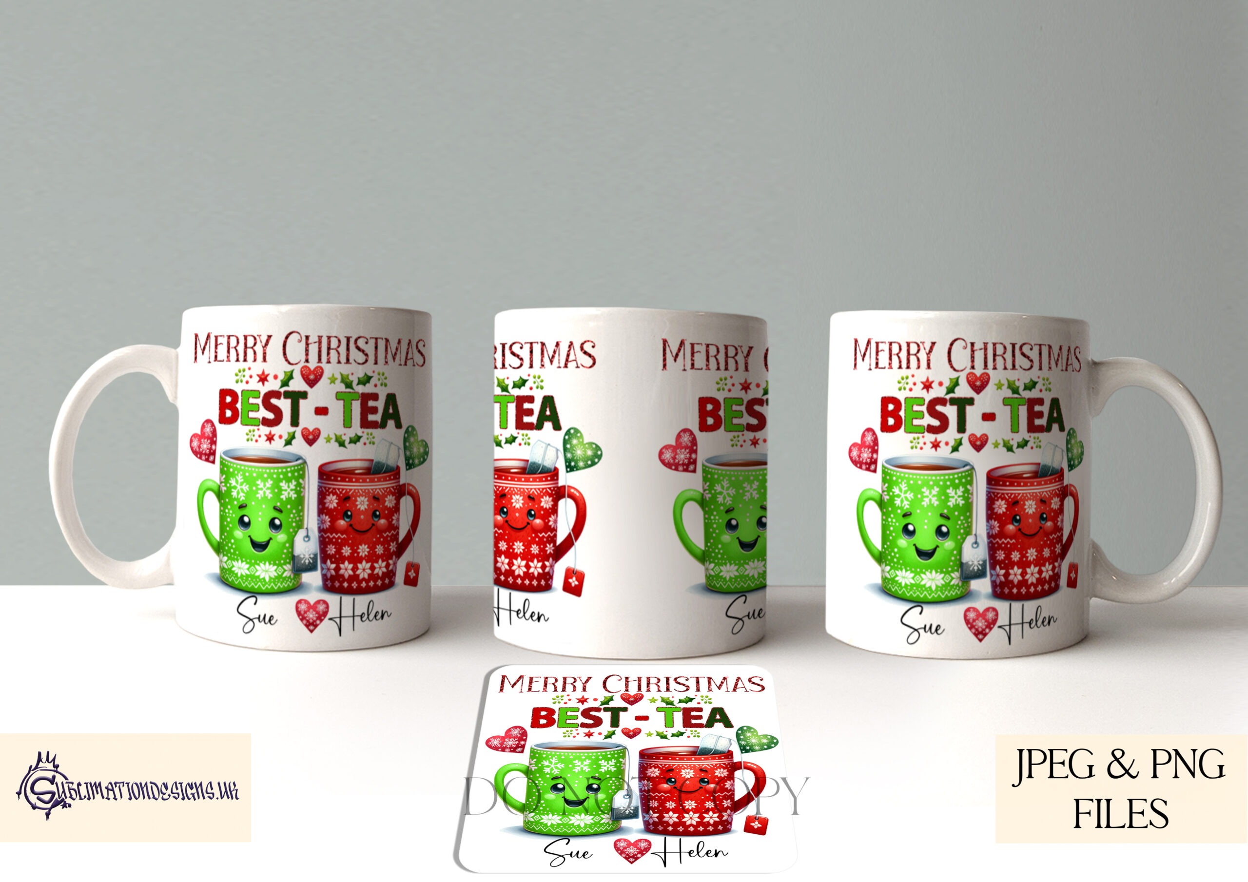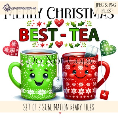 - Each design showcases a festive Christmas tea mug with the “Merry Christmas Best-Tea” message.