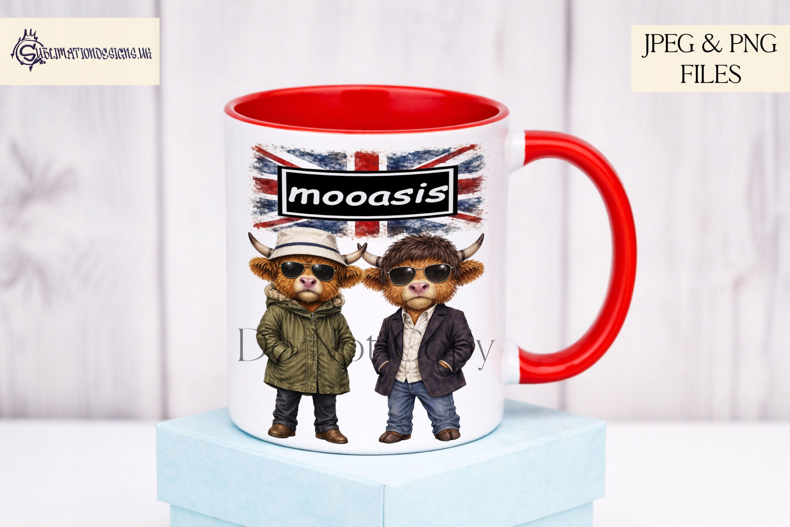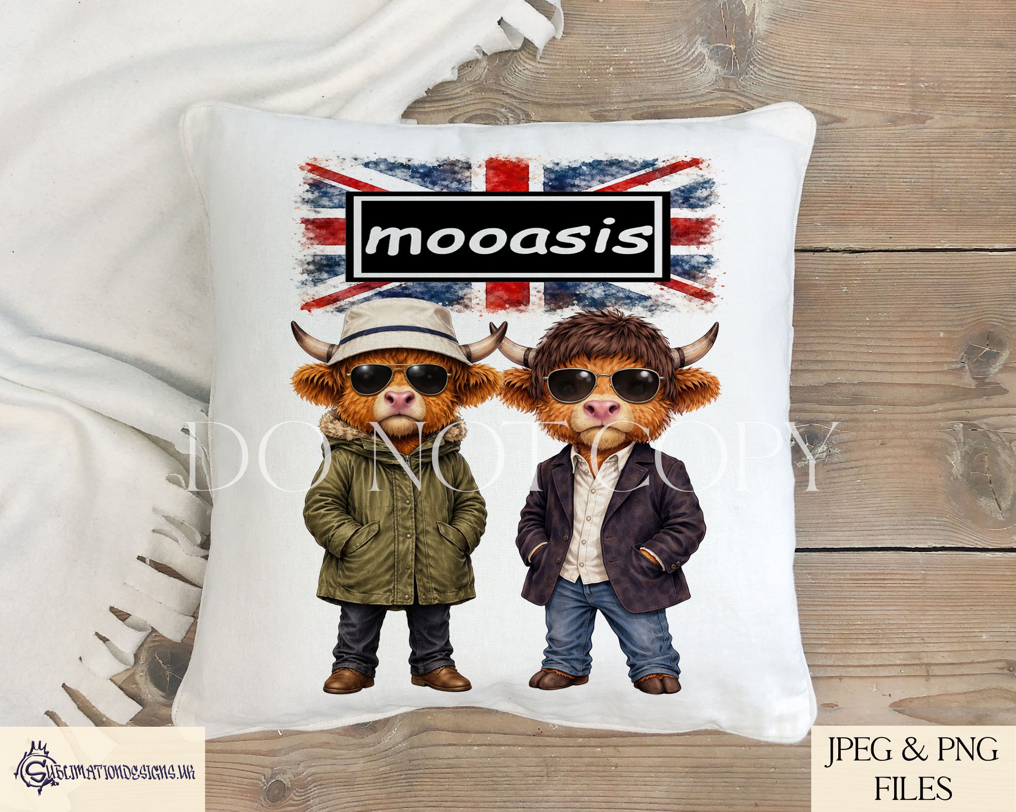 There are two individual cow designs, a blank banner for adding your own wording, and the full composition supplied with and without the Mooasis wording. This gives you flexibility for personalising and creating multiple product styles.
