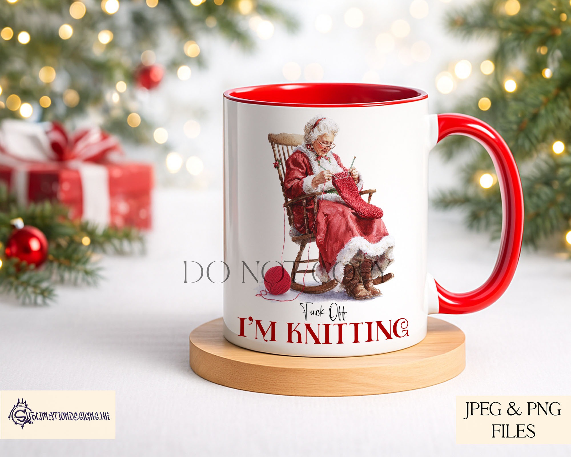 The set includes four layouts. You receive a textless version, a Fuck Off I’m Knitting design, a Bugger Off version and a Mrs Claus Knitting Co layout. All files are supplied in JPEG and PNG at 300 DPI. They resize well for many products including hoodies, tote bags, mugs and decorations. To help you present your finished items, the set includes three clean mock ups.