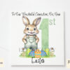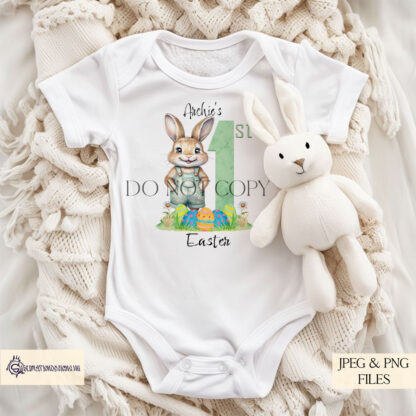 Introducing the My First Easter Boy Bunny in Dungarees Design Set, a sweet and playful Easter design featuring an adorable boy bunny in dungarees. This set of two designs is perfect for baby’s first Easter gifts and personalised keepsakes.