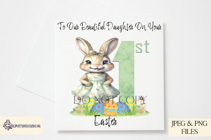 Introducing the My First Easter Girl Bunny in Pastel Floral Dress Design Set, a sweet and delicate Easter design featuring an adorable girl bunny in a pastel floral dress. This set of two designs is perfect for baby’s first Easter gifts and personalised keepsakes.
