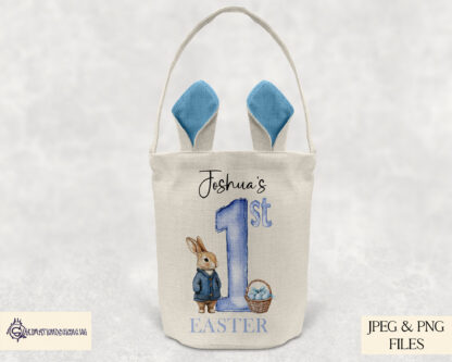 Celebrate your little one’s first Easter with this adorable blue-themed rabbit design. Featuring a cute boy rabbit wearing a blue cardigan, standing beside a basket of Easter eggs with the wording “1st Easter”, this design is perfect for sublimation projects and personalised gifts.