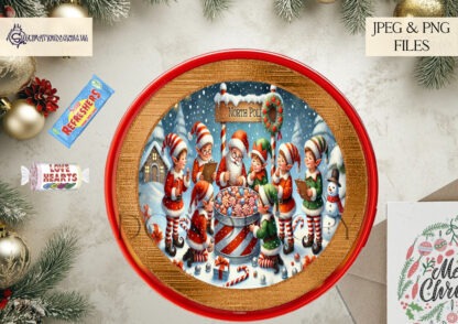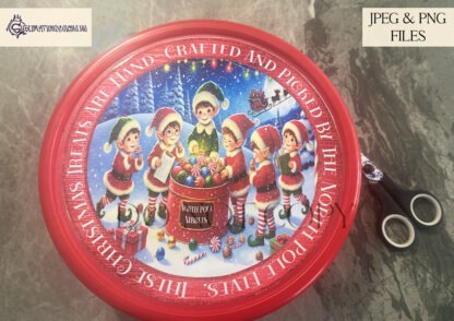 This North Pole Elves Tub Topper Designs Set includes 8 unique designs, ideal for creating festive sweet tubs. Perfect for Celebrations, Heroes, Roses, and Swizzles tubs. Includes high-resolution JPEG and PNG files with 3 mock-up images. Create up to 500 physical products with instant digital download.