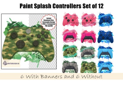 Add a burst of colour to your gaming-themed creations with our Textless Paint Splash Gaming Controller Designs Set. This versatile set includes 12 high-resolution designs featuring game controllers in blue, pink, and camouflage styles. Each comes in two styles inspired by popular consoles – Xbox and PlayStation – with and without banners so you can add your own text.