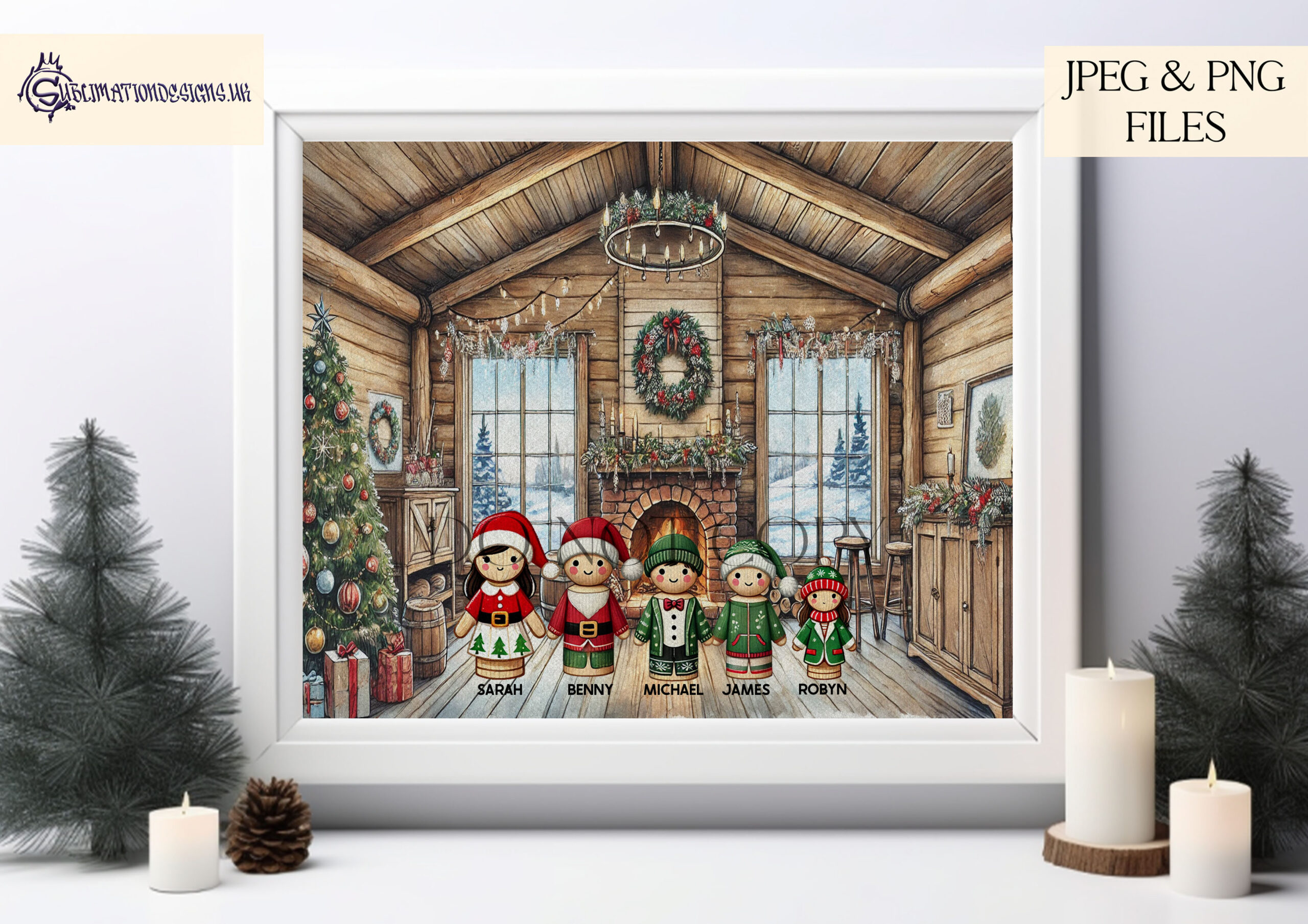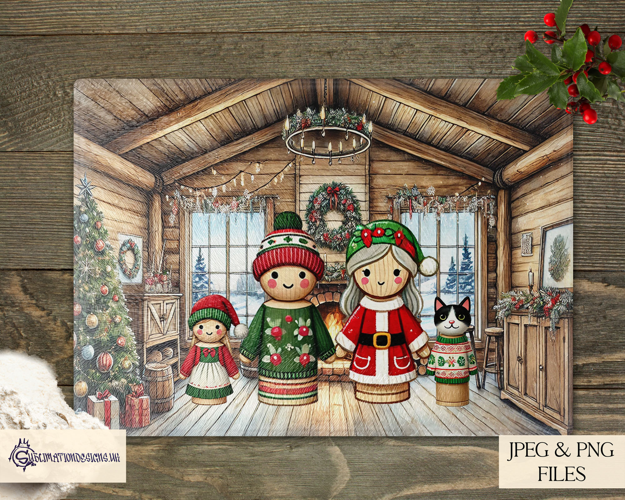 Create charming, personalised family Christmas products with our Peg Doll Family Clip Art Set. This versatile collection includes 38 delightful elements featuring peg doll family members, perfect for customising baubles, cushions, wall art, Christmas cards, and more. Inspired by our popular Gonk gnome family set, this collection lets you design your unique family set-up, including pets like cats and dogs. With two background options and four mock-ups, this set offers endless possibilities for festive family décor.