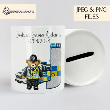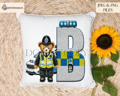 This Police Officer Teddy Bear Alphabet Design Set includes 26 A-Z police-themed letters with a teddy bear in uniform and a police car. Perfect for personalised gifts and sublimation projects. Includes JPEG and PNG files with 4 mock-up images. Create up to 500 physical products with instant digital download.