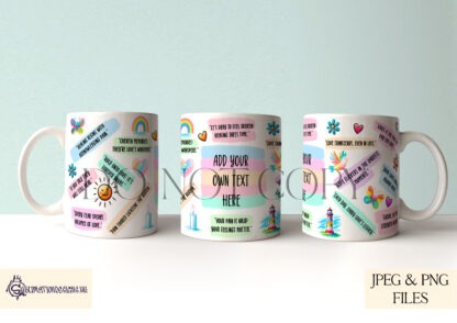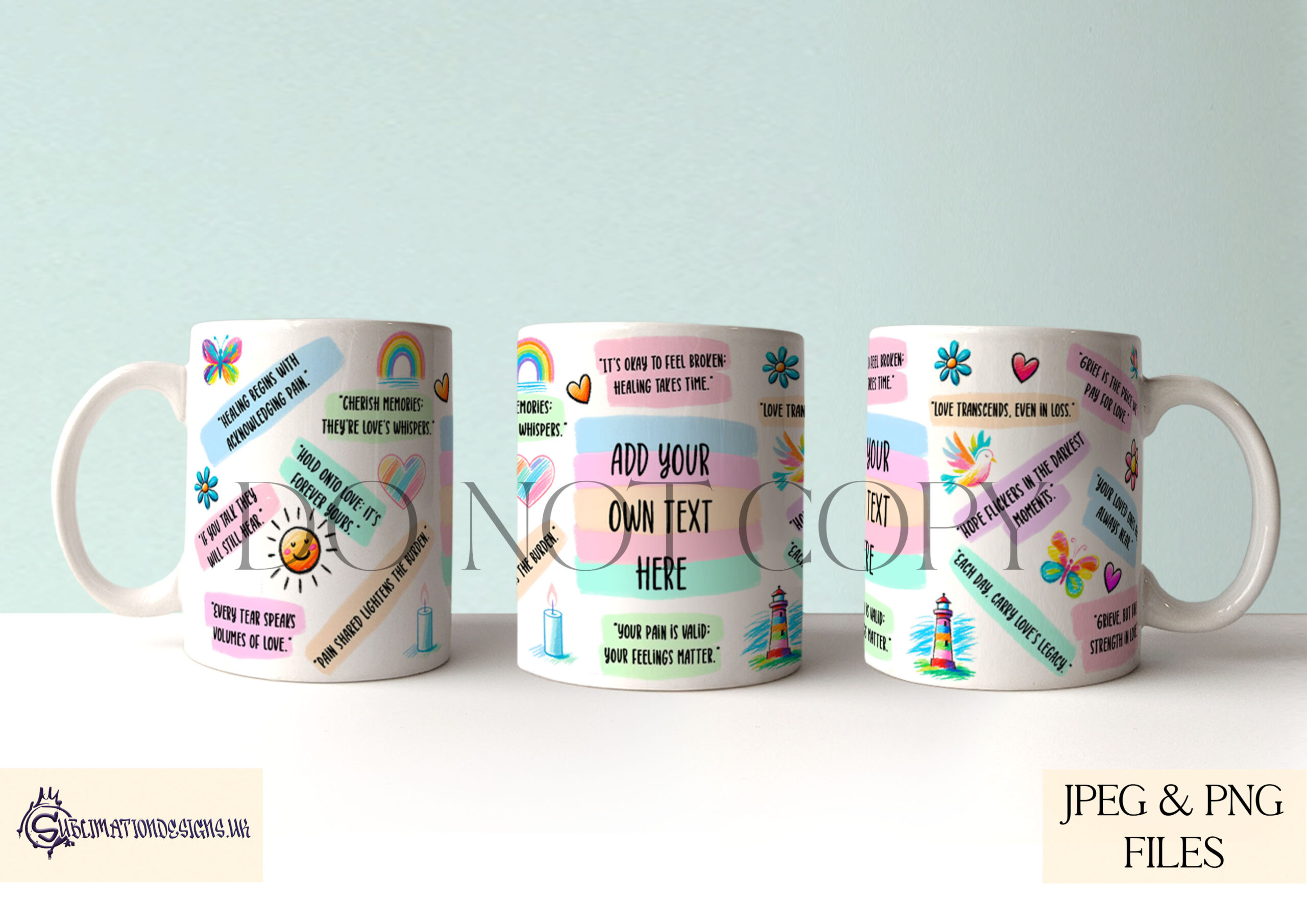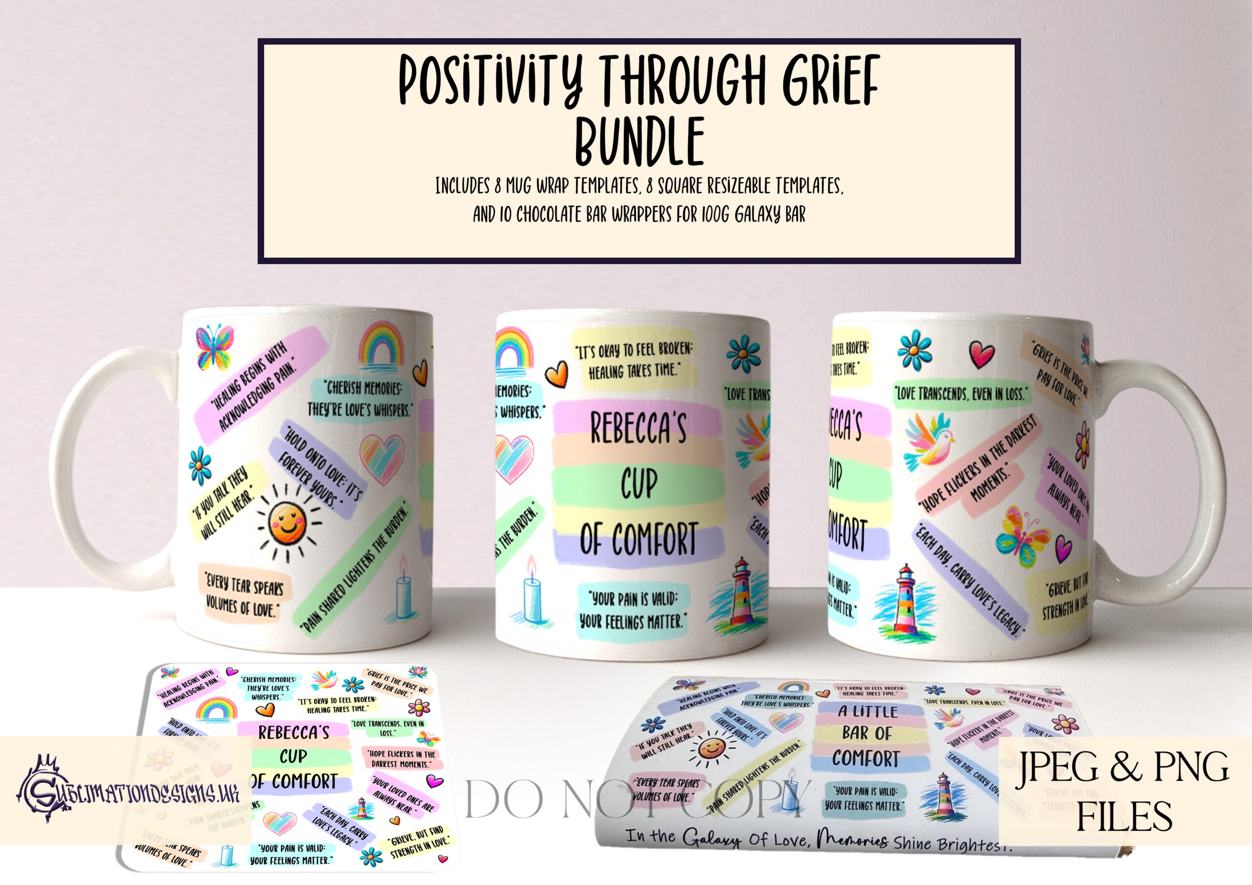 - Positivity Through Grief Mug Wrap Templates – Templates for creating comforting mugs with motivational and memorial-themed designs