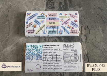 - Positivity Through Grief Chocolate Bar Wrappers – 10 chocolate bar designs featuring uplifting quotes and comforting artwork