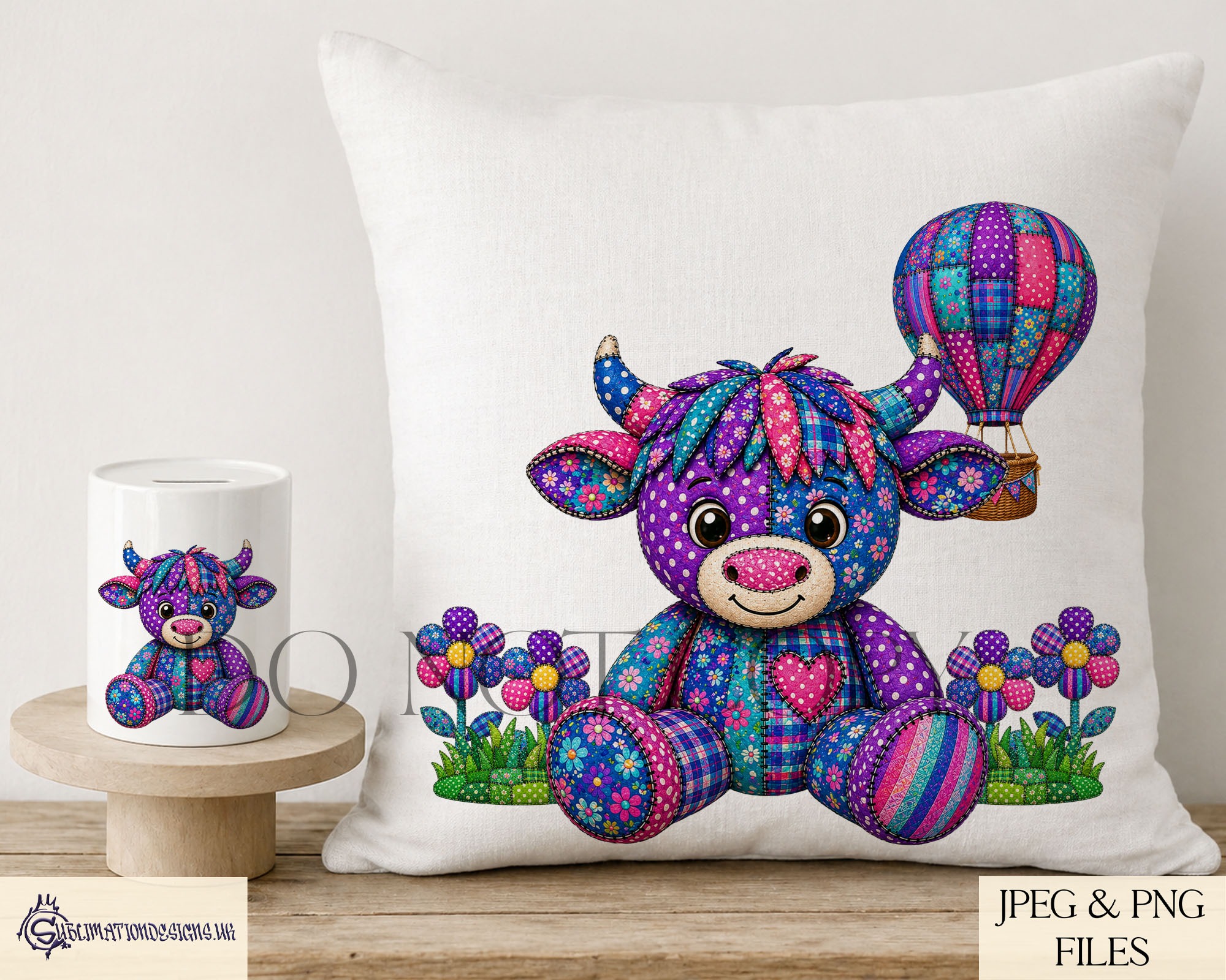 Purple Patchwork Animal Teddies Set of 5 includes five textless patchwork animal designs in a soft purple theme, featuring a Highland cow, teddy bear, elephant, lion and giraffe, plus 4 background elements. Supplied in JPEG and PNG with 4 mock ups and a commercial licence for up to 500 physical products.