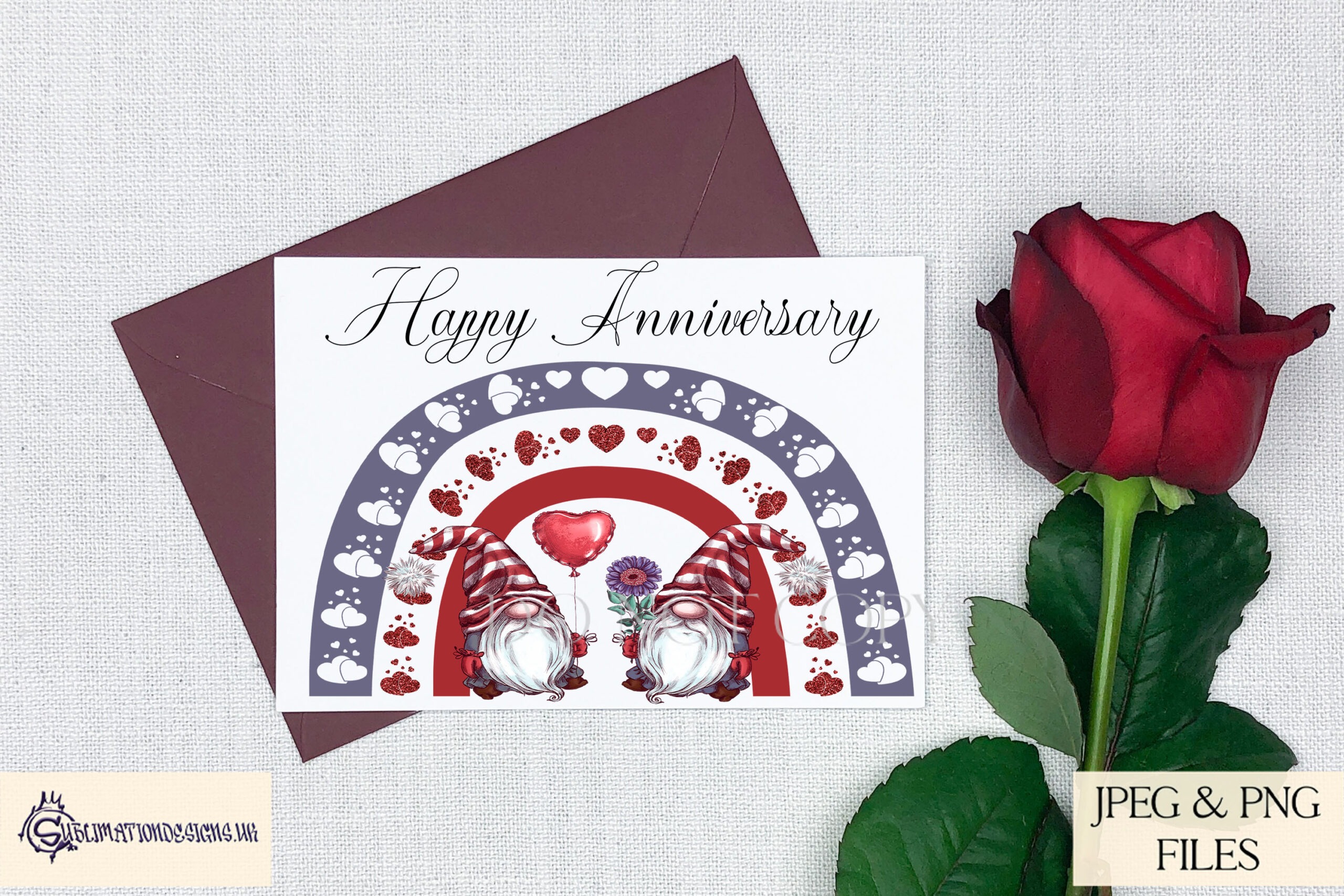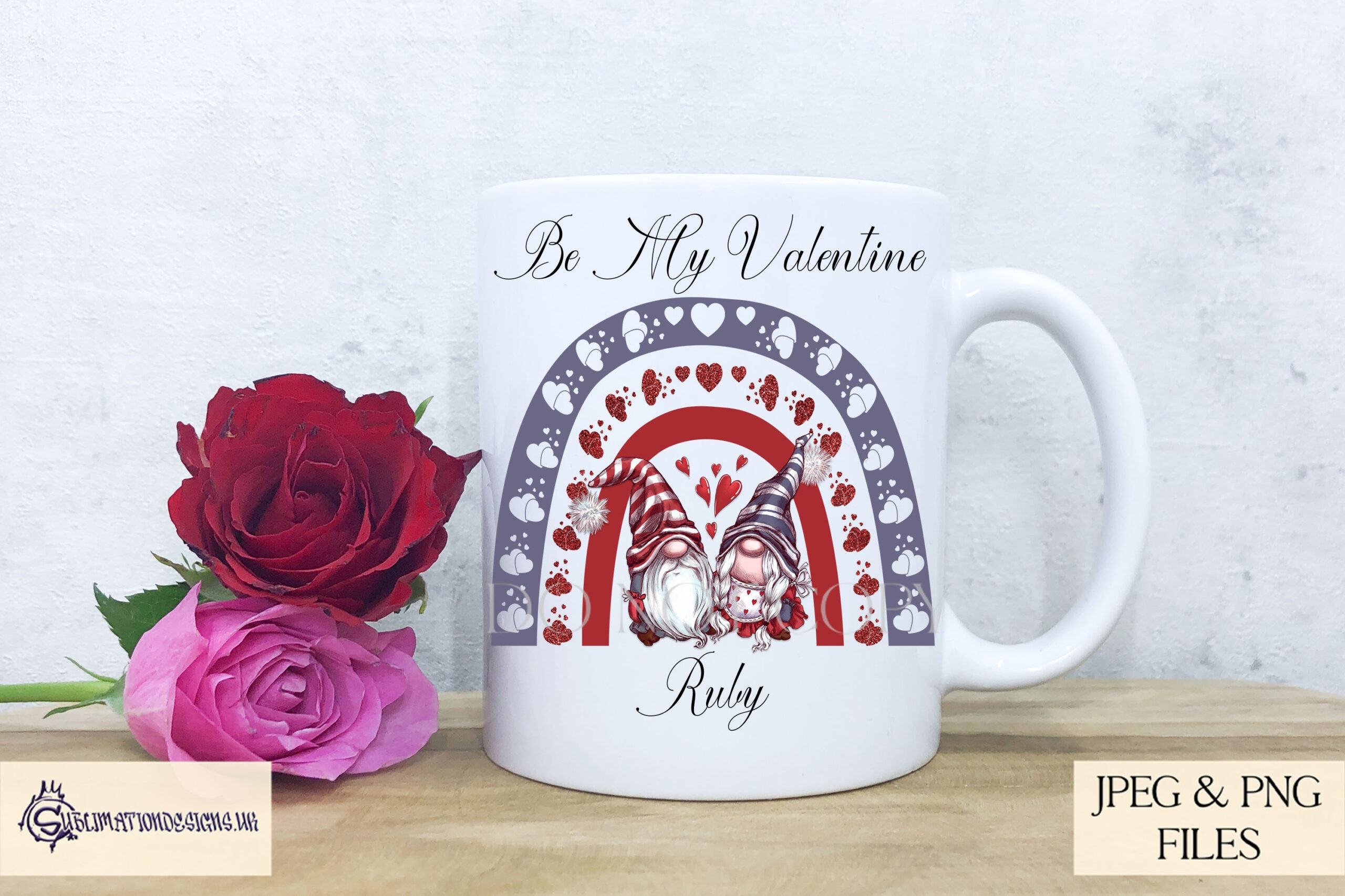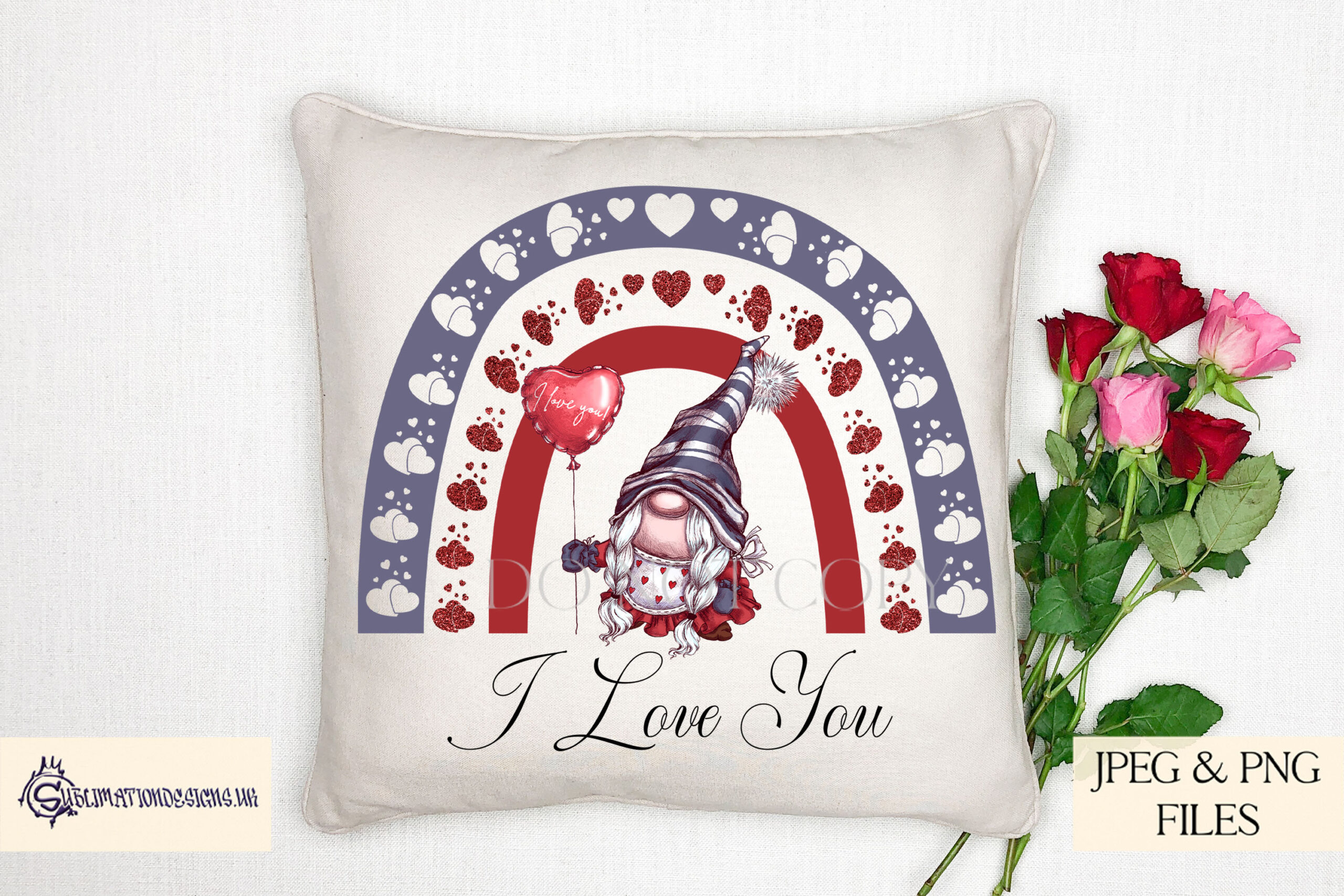 Each design features a rainbow made of love hearts, with gonk gnomes underneath. The theme is bright and cheerful, which makes it perfect for romantic gifts and also for general love themed products all year round.