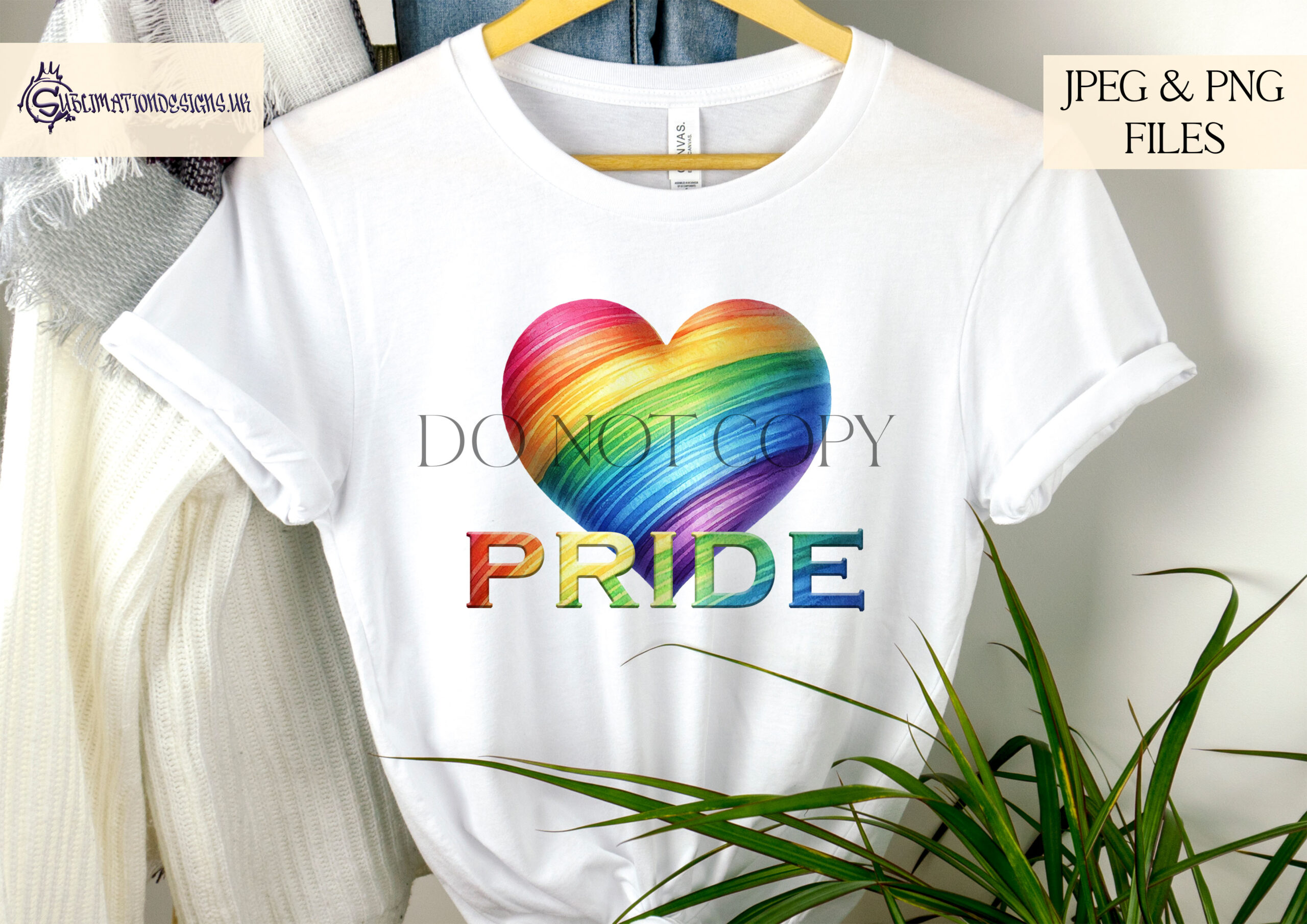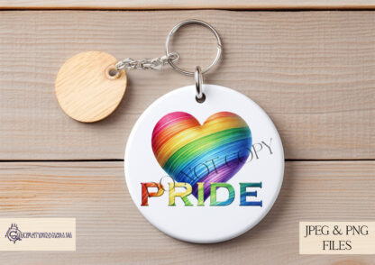 - Rainbow love heart with “PRIDE” wording.