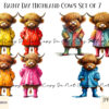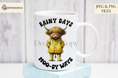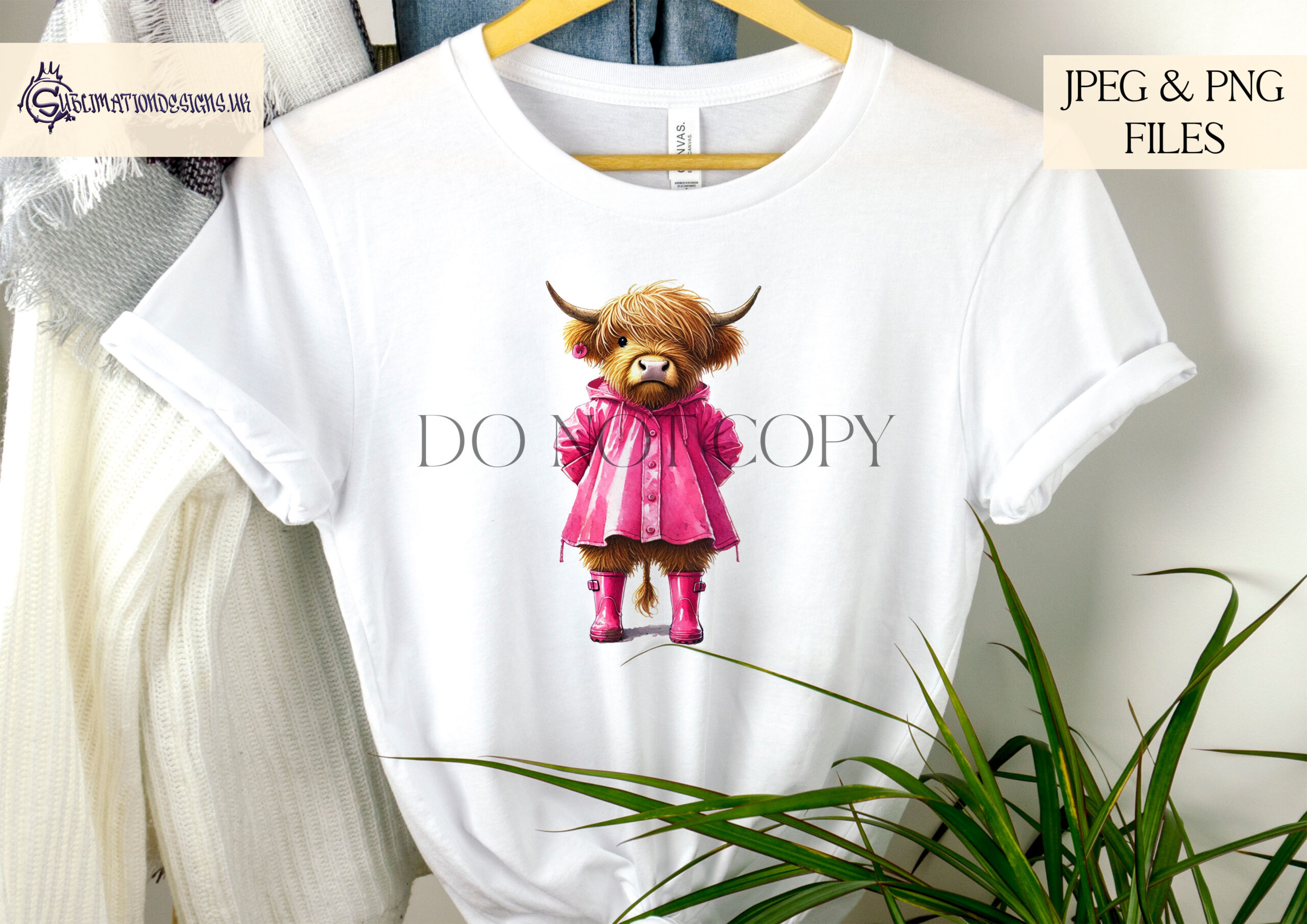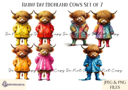 This Rainy Day Highland Cows Set of 7 includes adorable cows in colourful raincoats, plus 2 playful wording PNGs. Perfect for sublimation, cards, and more. Includes JPEG and PNG files with 3 mock-ups. Licence for up to 500 physical products.