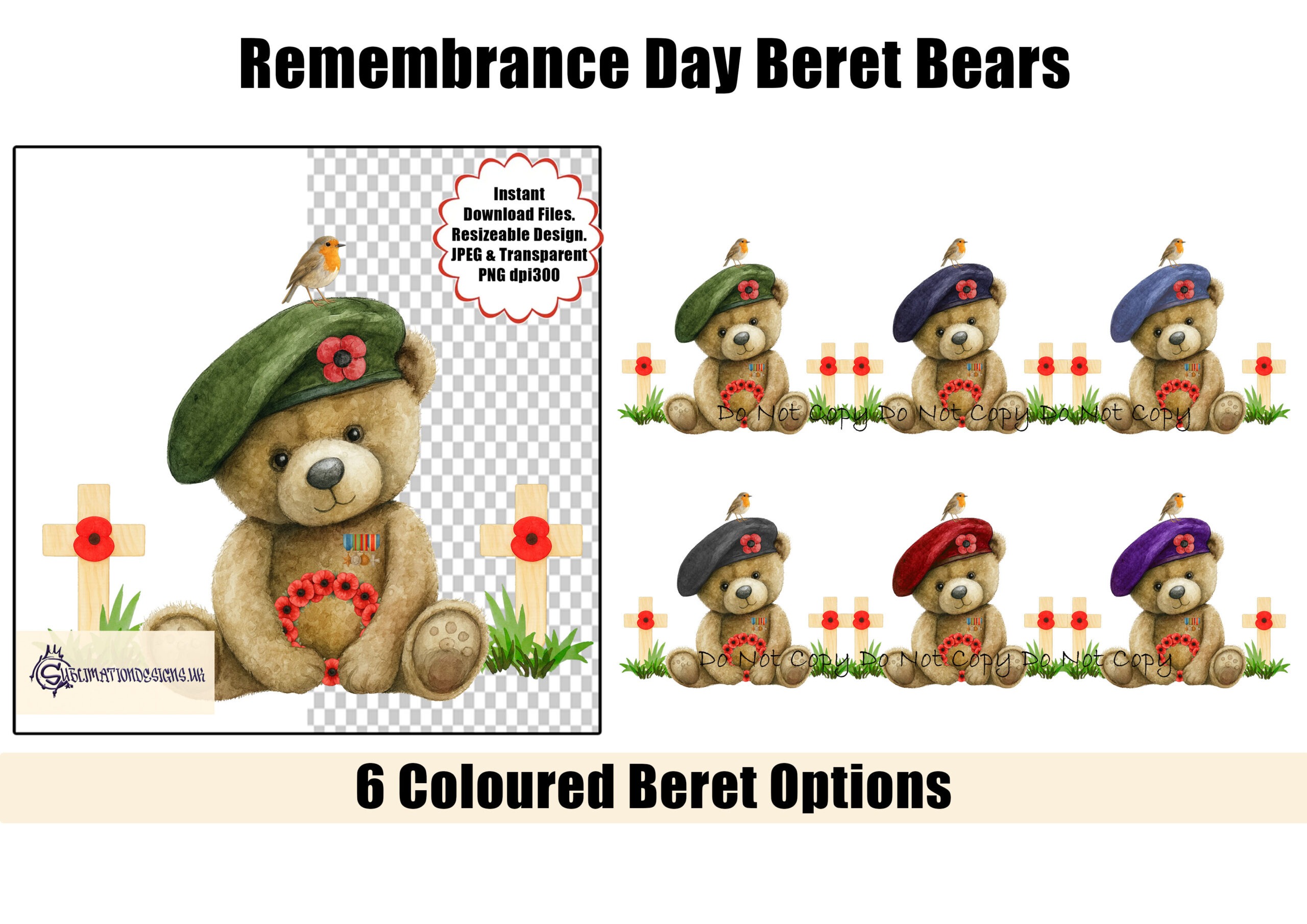 • 6 Remembrance Day beret bear designs (JPEG & PNG, 300 DPI)