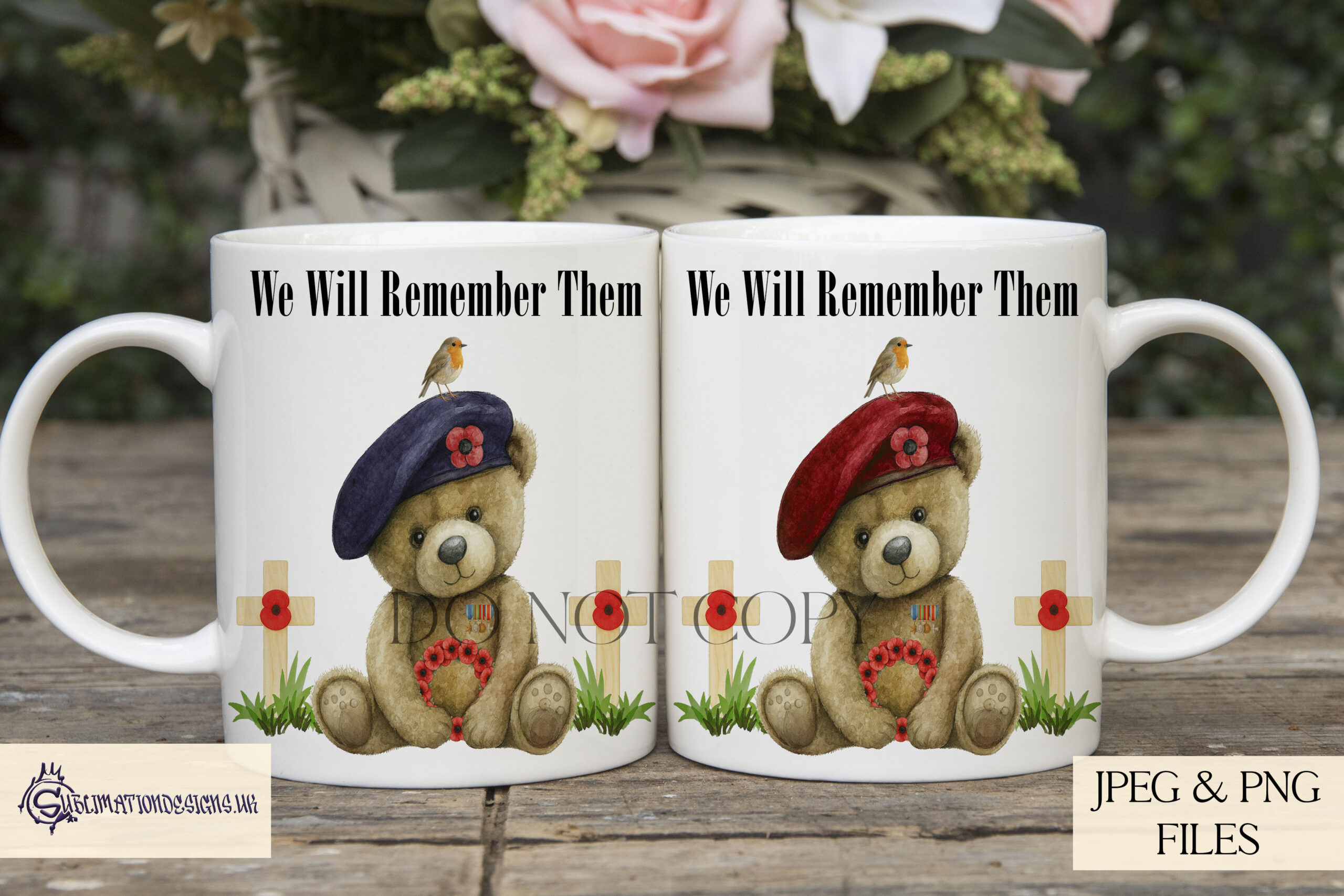 Each bear sits on grass surrounded by remembrance poppies, with a robin perched gently on the beret – a touching symbol of remembrance and hope. These designs are perfect for mugs, keyrings, t-shirts, cushions, and so much more. With 3 mock-ups included, it’s easy to showcase your finished products with pride.