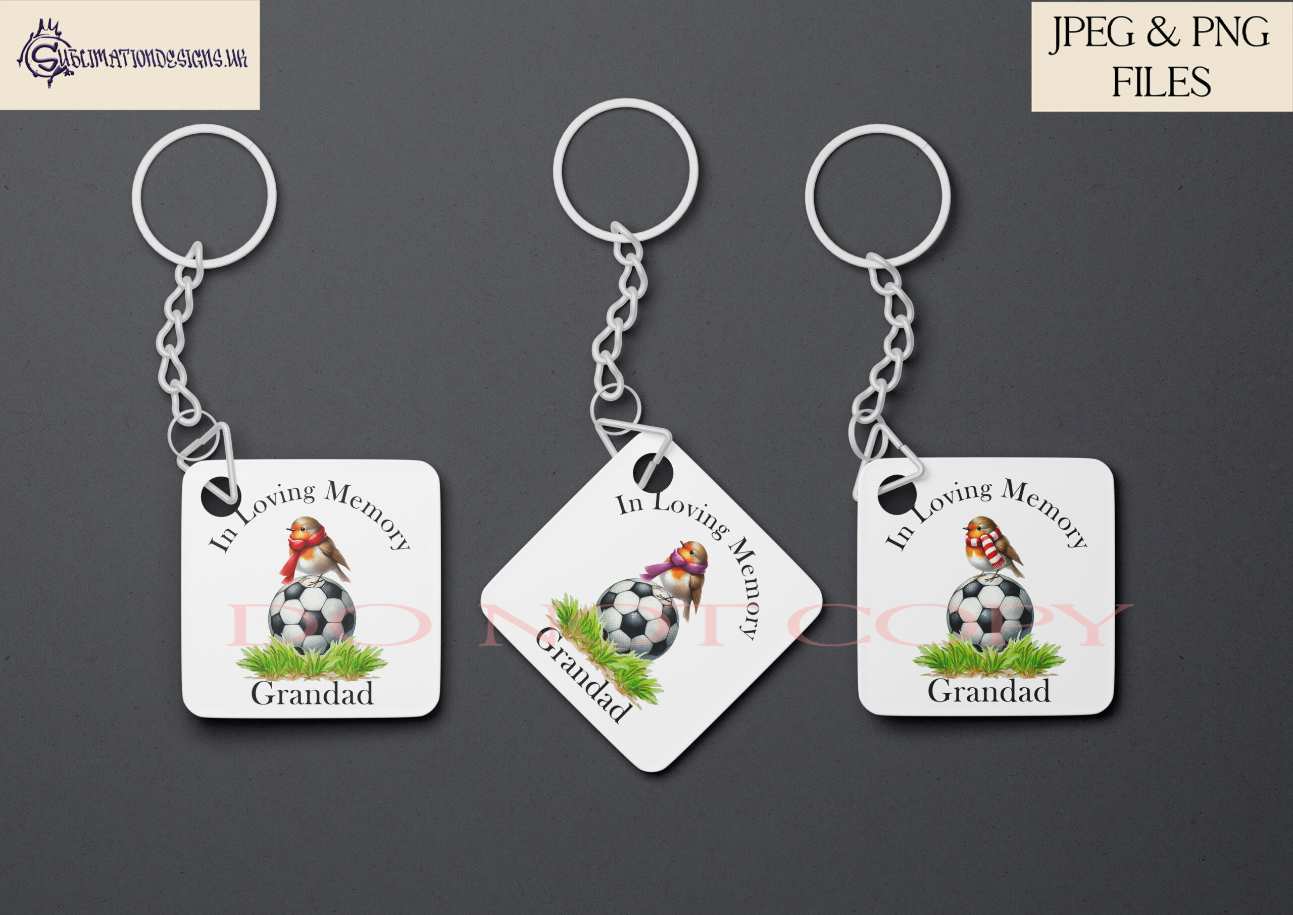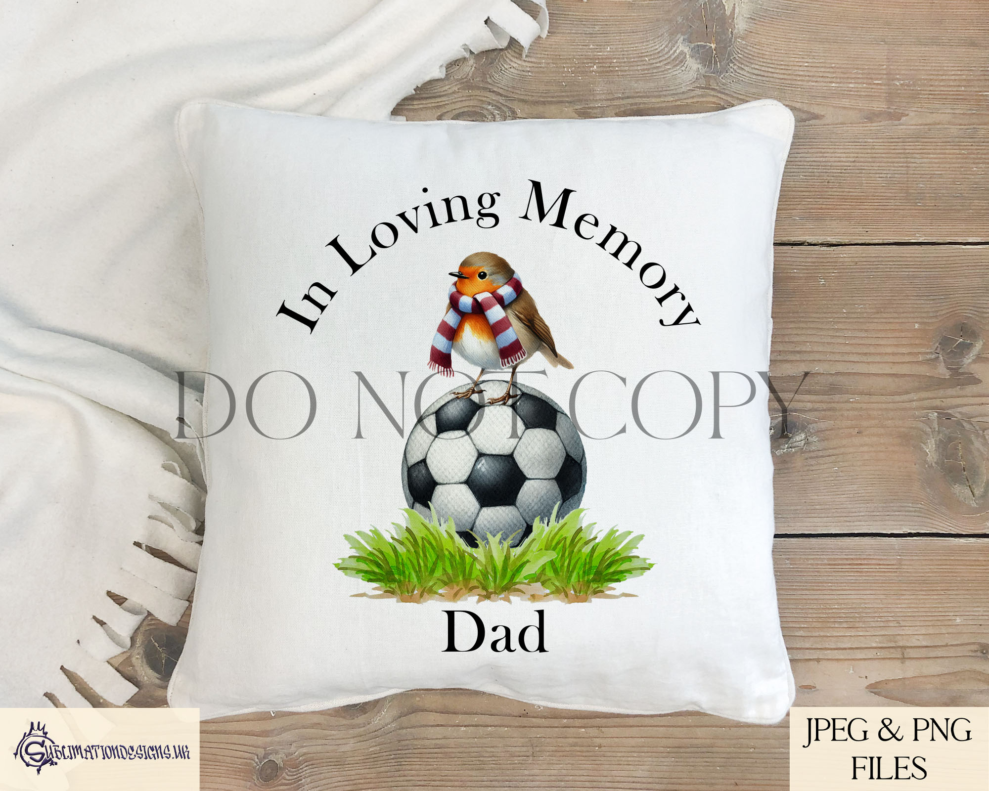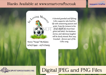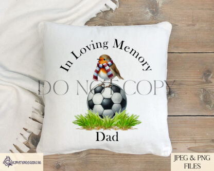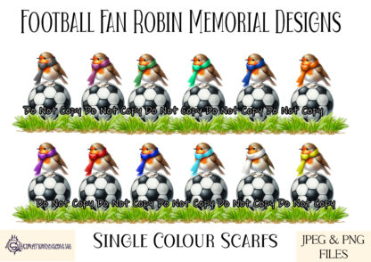 This Robin Football Memorial Design Set includes 30 designs featuring a robin perched on a football with plain and striped scarves in team colours. Comes with an “In Loving Memory” PNG, 3 mock-ups, and advert sheets. Ideal for personalised memorials and tributes.