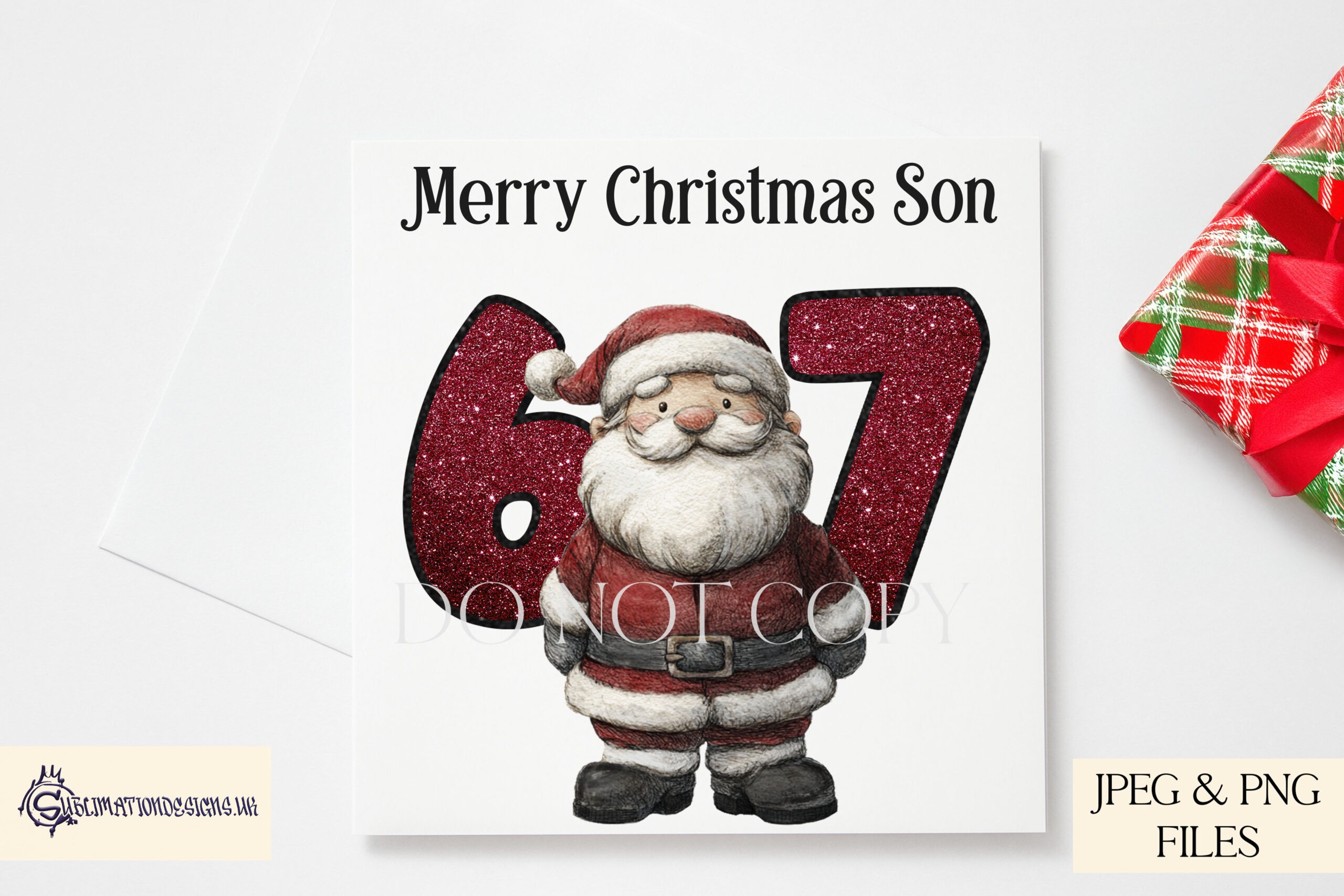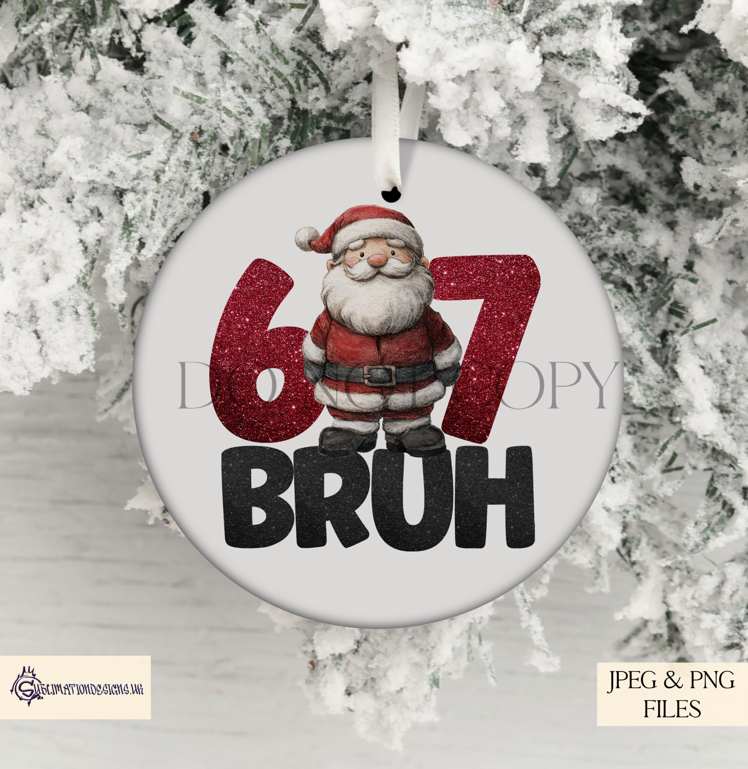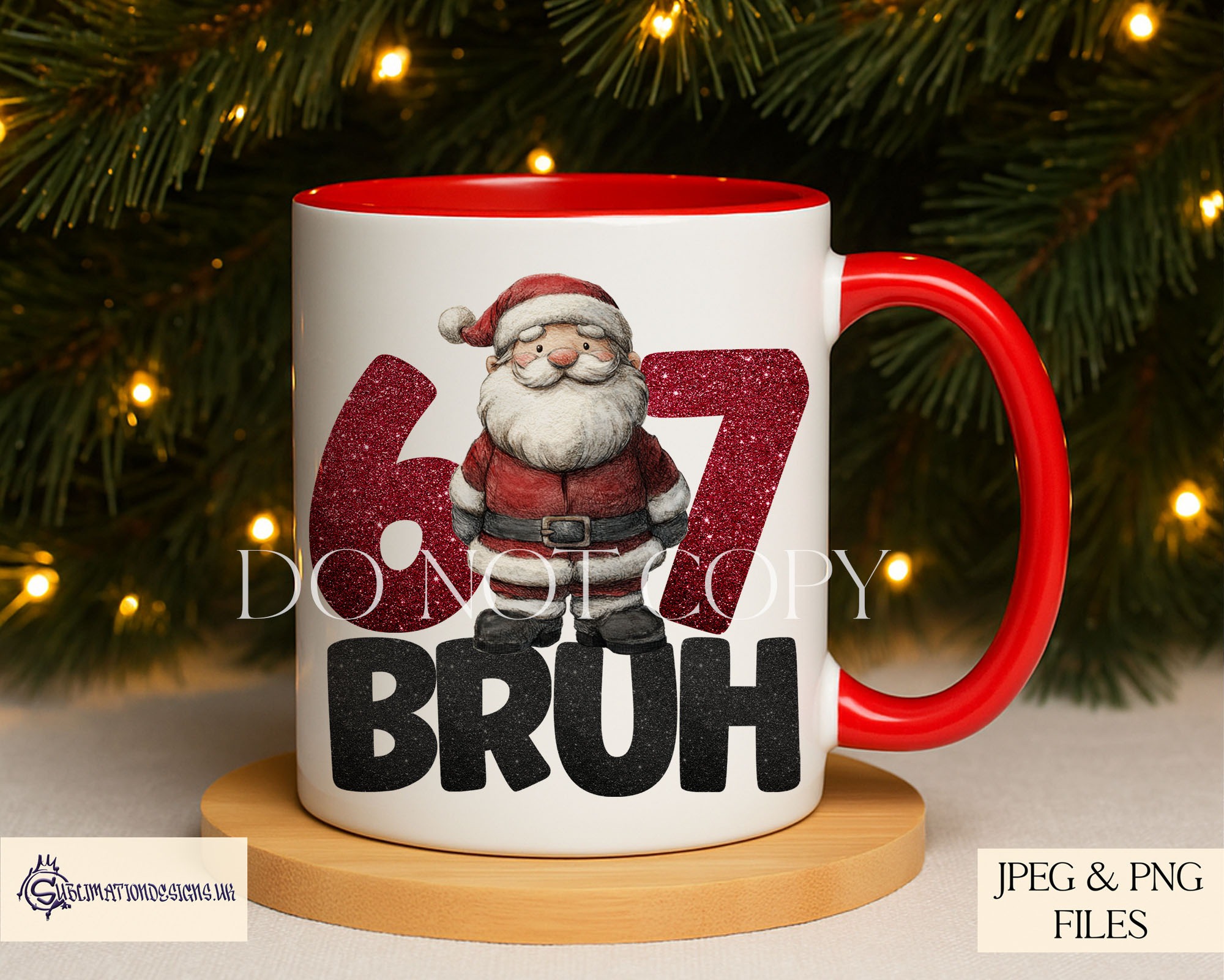 The bundle includes four designs. You receive a 6 7 Squad version, two 6 7 Bruh variations and a standard 6 7 design. All files are supplied in transparent PNG and JPEG at 300 DPI, so you can use them for sublimation, DTF and UVDTF printing. These designs suit pyjamas, baubles, mugs and many more Christmas themed items. To help you show your finished products clearly, the set includes four clean mock ups.