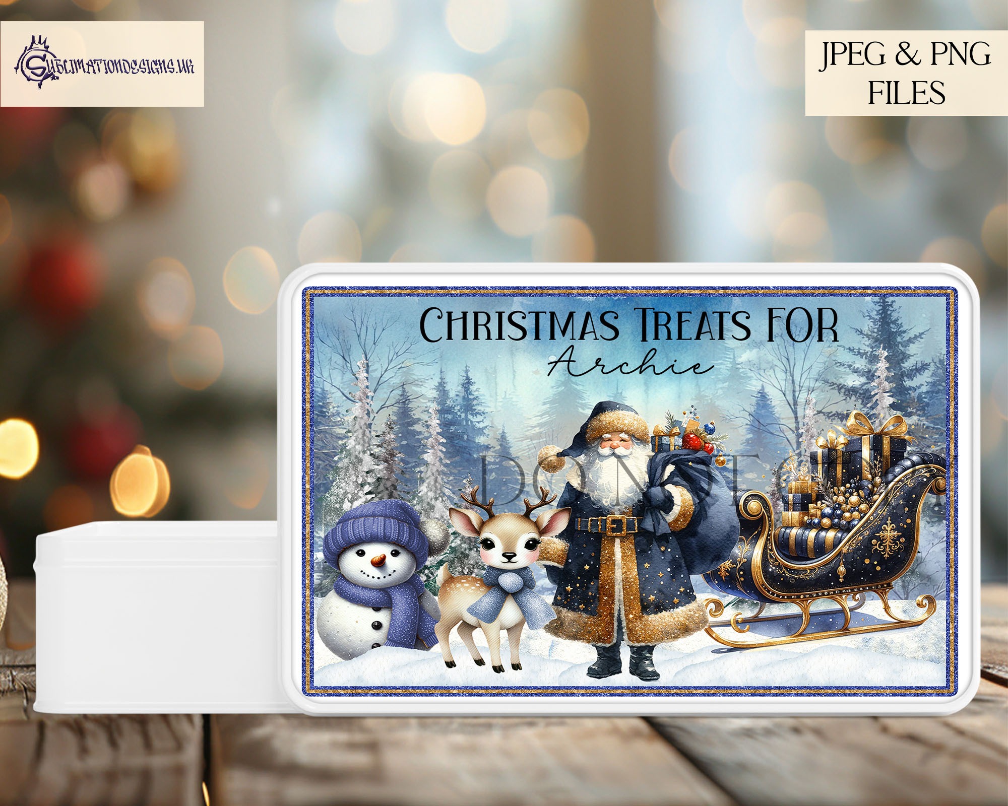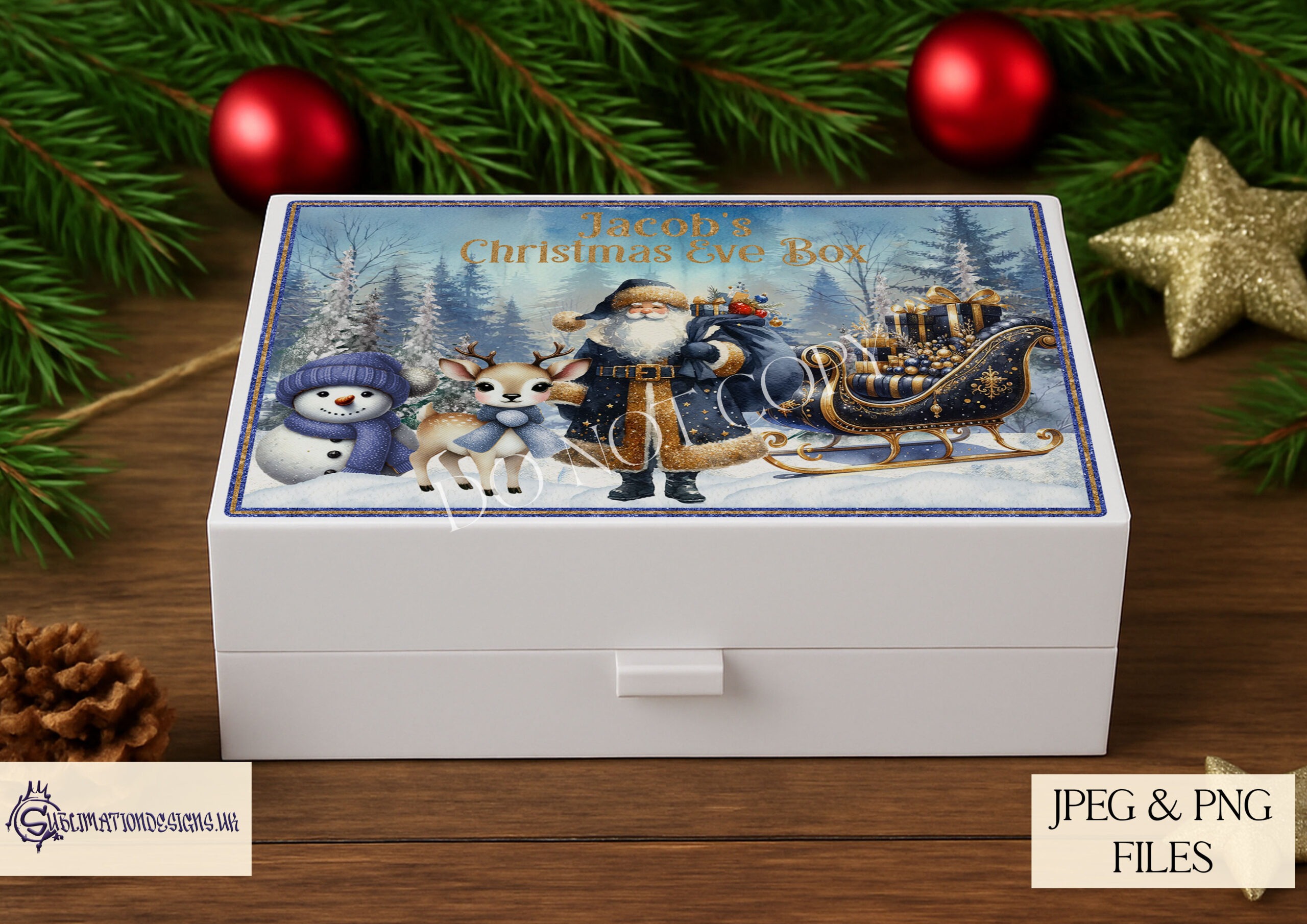 The Santa and Friends Landscape Design Navy Blue and Gold Edition brings a luxurious festive look to your handmade Christmas products. This version uses our exclusive Santa artwork in a deep navy and shimmering gold palette, giving your items a warm but elegant Christmas feel. While this set works beautifully for Christmas Eve boxes, it also suits chopping boards, tins and many other seasonal gifts.