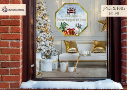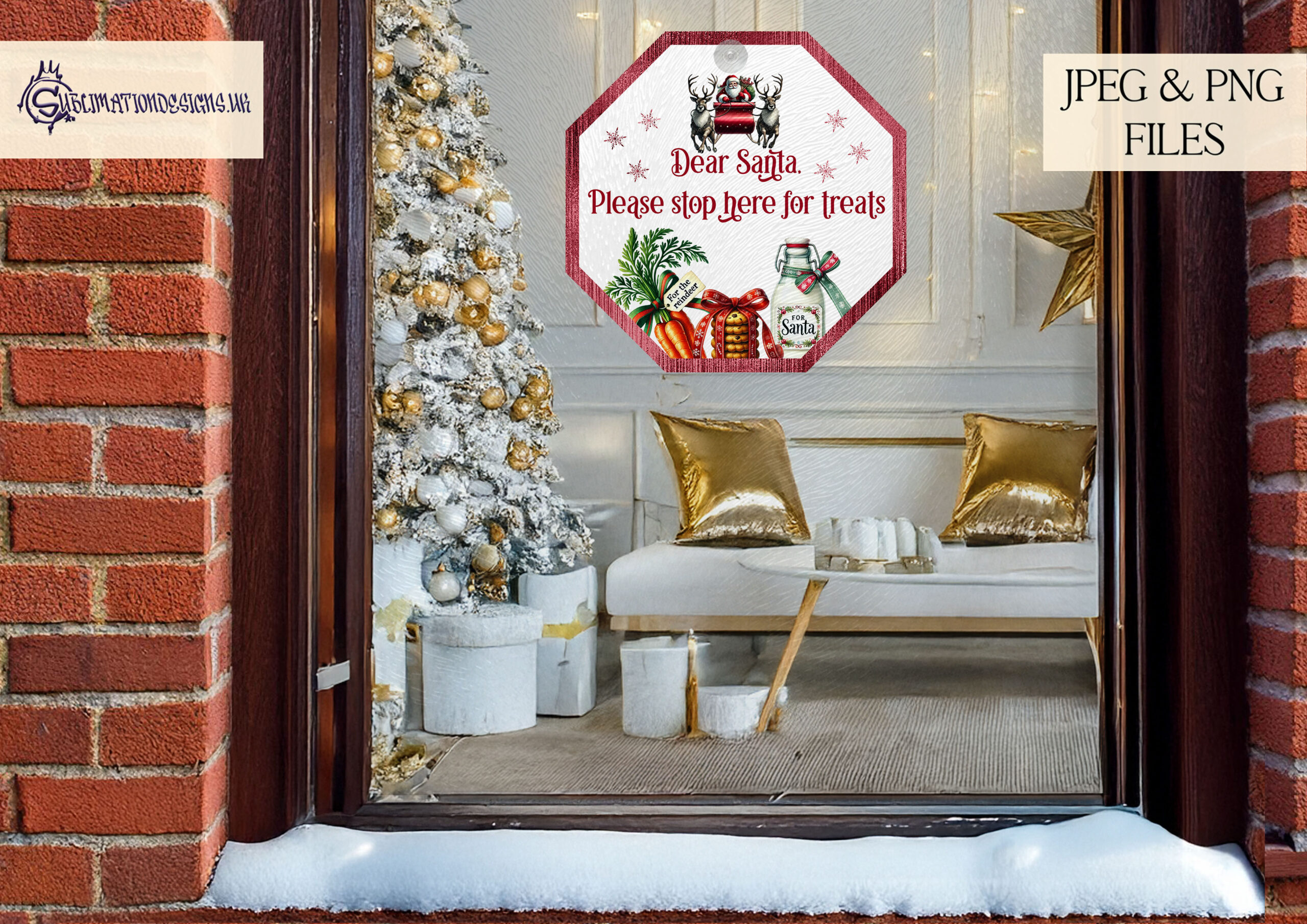 This Santa Please Stop Here for Treats Design Set includes 3 hexagonal designs in red, green, and gold, with an additional blue sky background option. Perfect for TL Blanks and sublimation projects. Includes high-resolution JPEG and PNG files with 3 mock-up images. Create up to 500 physical products with instant digital download.