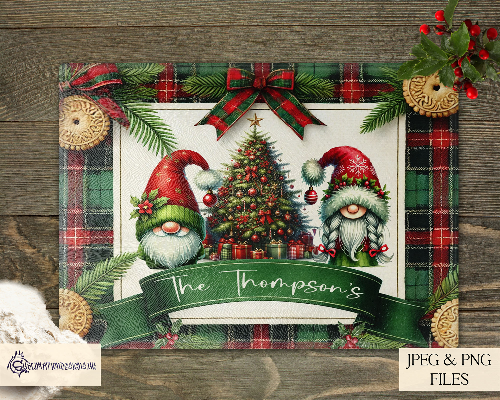 These designs bring warmth, colour, and a classic festive feel to your products. Perfect for decorating biscuit tins, cards, chopping boards, coasters, and more. Each design is supplied in JPEG and PNG formats for easy printing and includes a PSD file with a Smart Layer so you can add your own image into the frame for personalised projects.