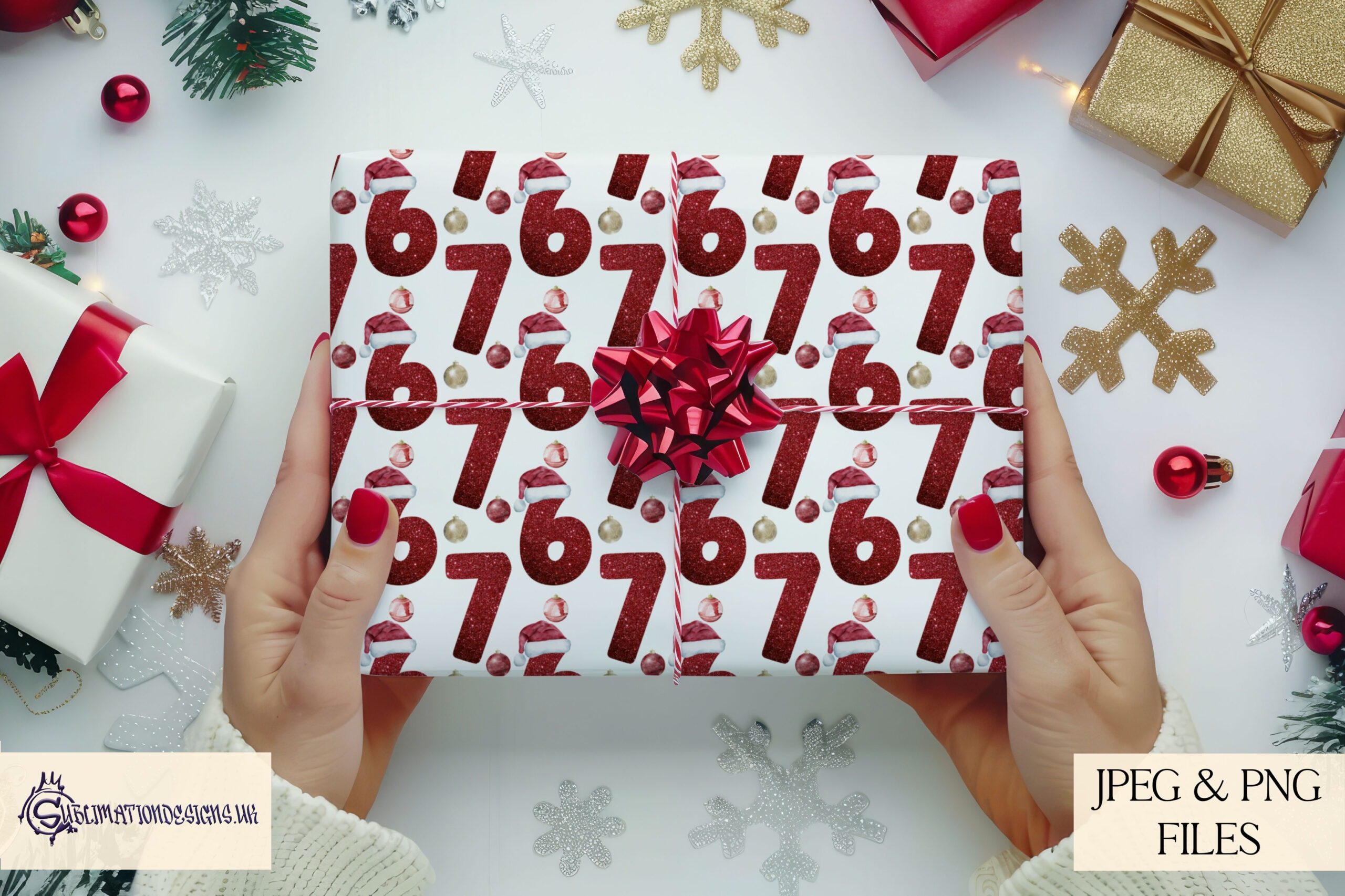 The bundle includes nine designs in total. You receive glitzy Six Seven layouts that suit baubles and decorations, mug wraps in matching colours and a seamless pattern in each of the three colour options. The colours include red, green and gold. All files are supplied in JPEG and PNG at 300 DPI. Because the artwork is clean and sharp, it resizes well on many blanks. To help you present your finished work, the set includes four mock ups.