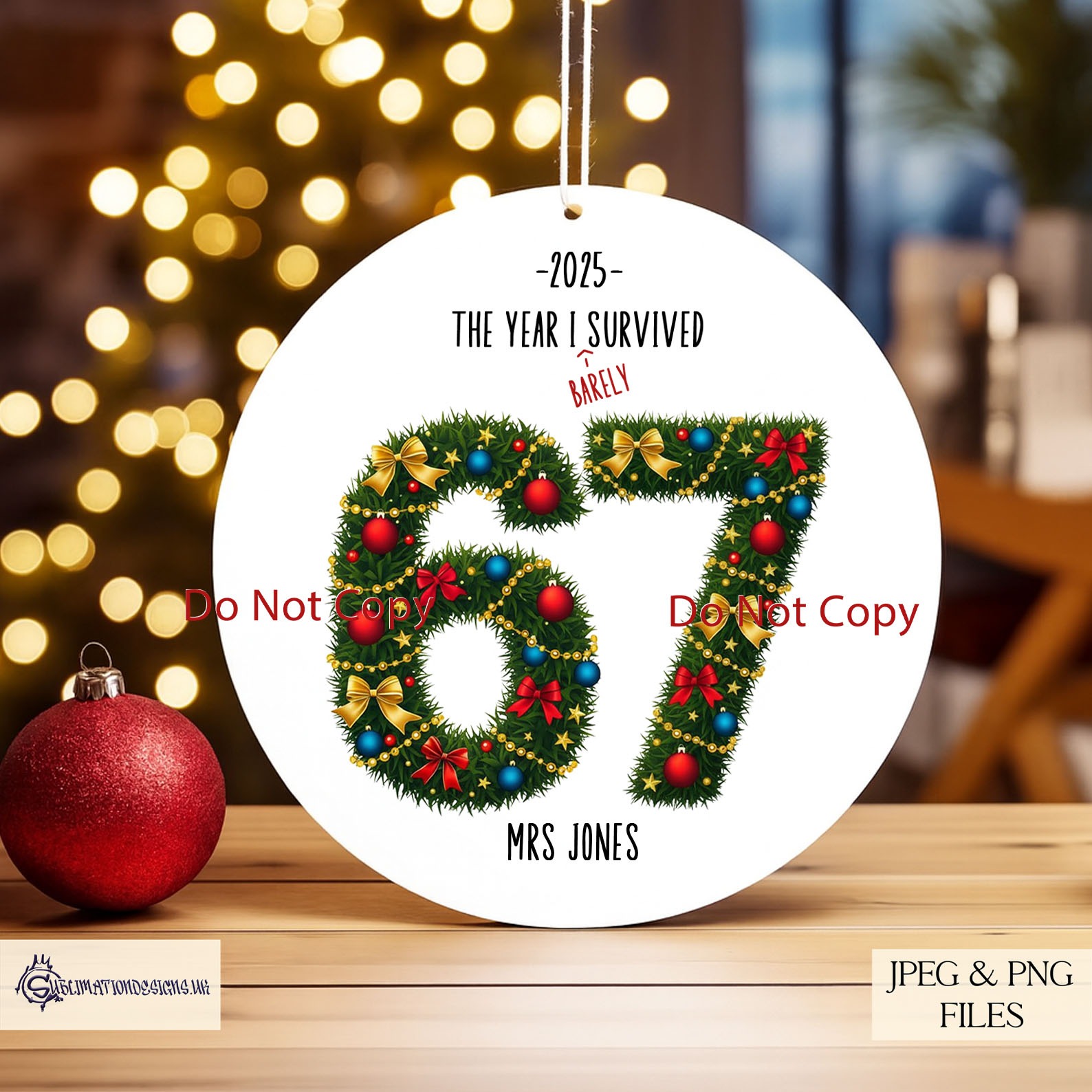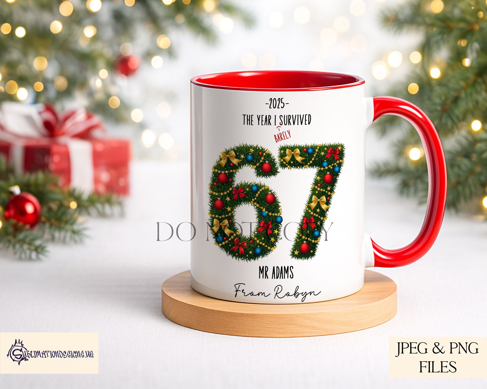 You receive four versions in total. The set includes a standard Six Seven wreath design, a Six Seven text layout, a 2025 The Year I Survived 67 version and a Barley Survived 67 version. All artwork is supplied in JPEG and PNG at 300 DPI, which allows you to resize and print cleanly on a wide range of products. To help you showcase your finished work, the set includes three mock ups.