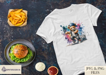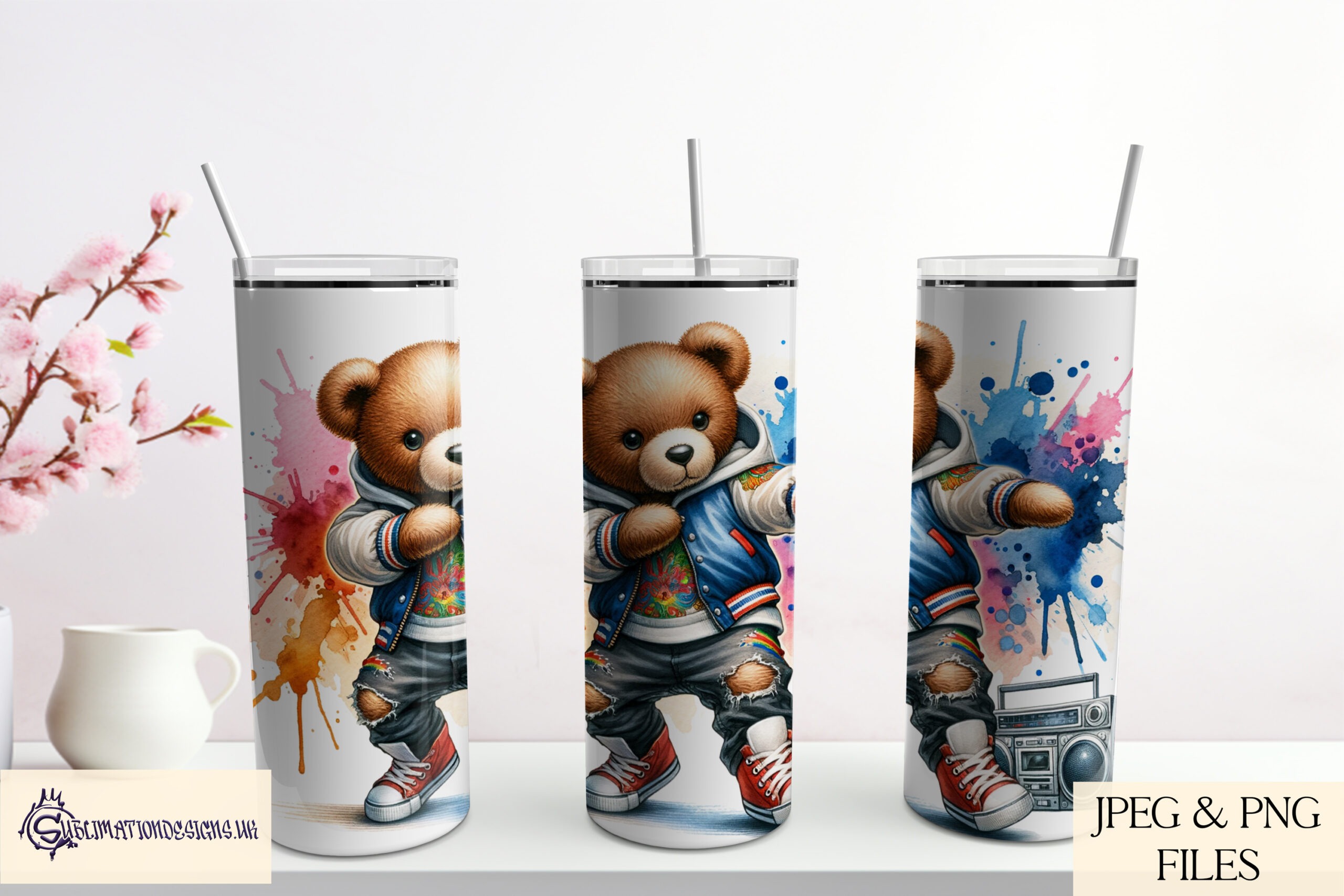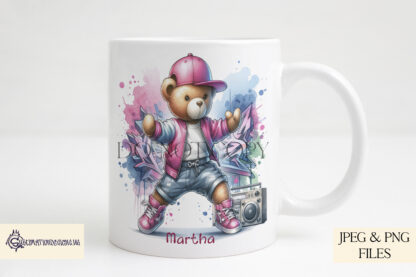 This upbeat digital design set includes four teddy bear characters, each striking their own dynamic street dance pose, set against vibrant paint splash backgrounds.