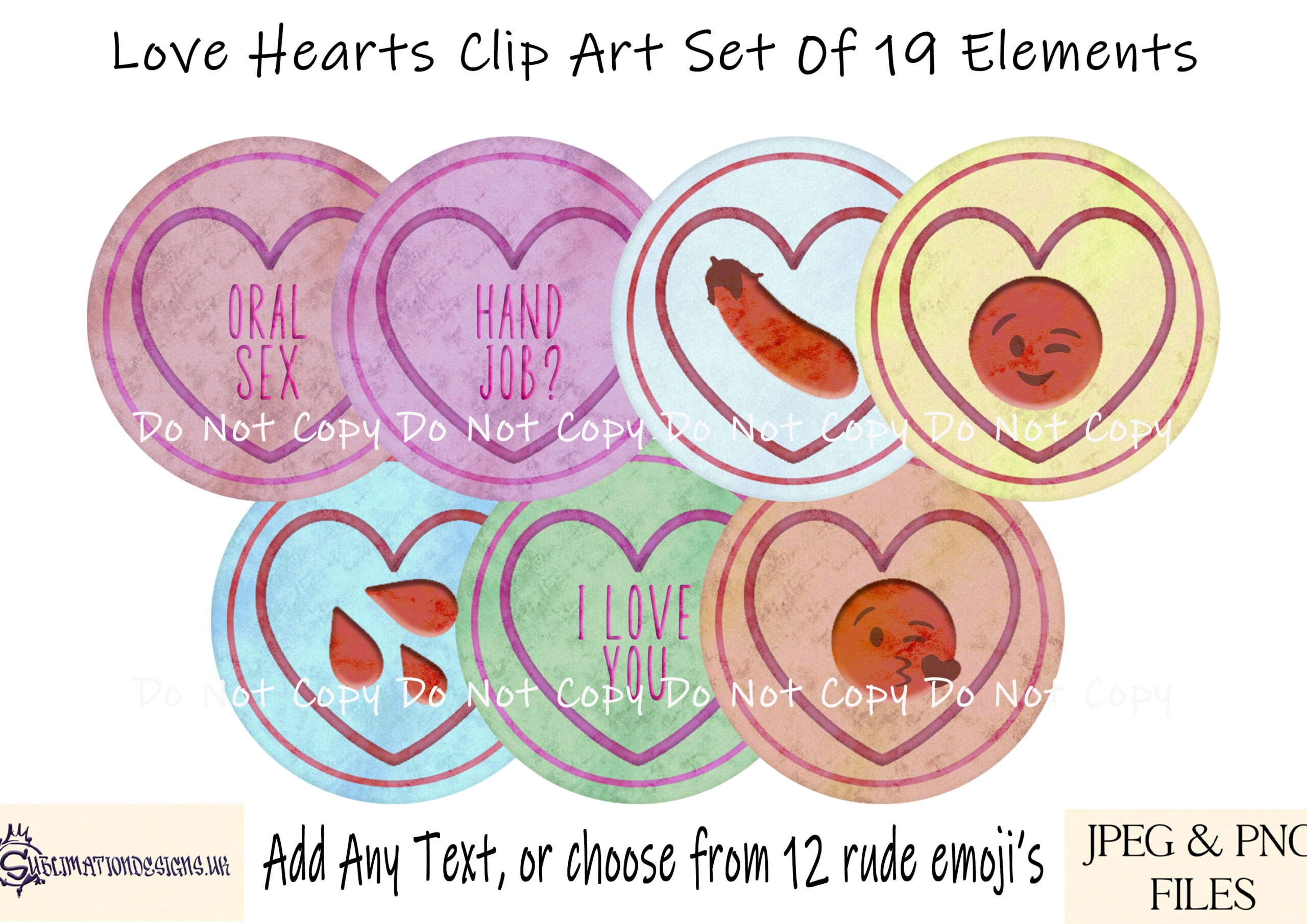 This Sweet Hearts Clip Art Set includes 19 candy-inspired designs, featuring 7 textless hearts and 12 adult humour emoji hearts. Perfect for Valentine’s Day projects and gifts. Includes JPEG and PNG files with 4 mock-up images. Create up to 500 physical products with instant digital download.