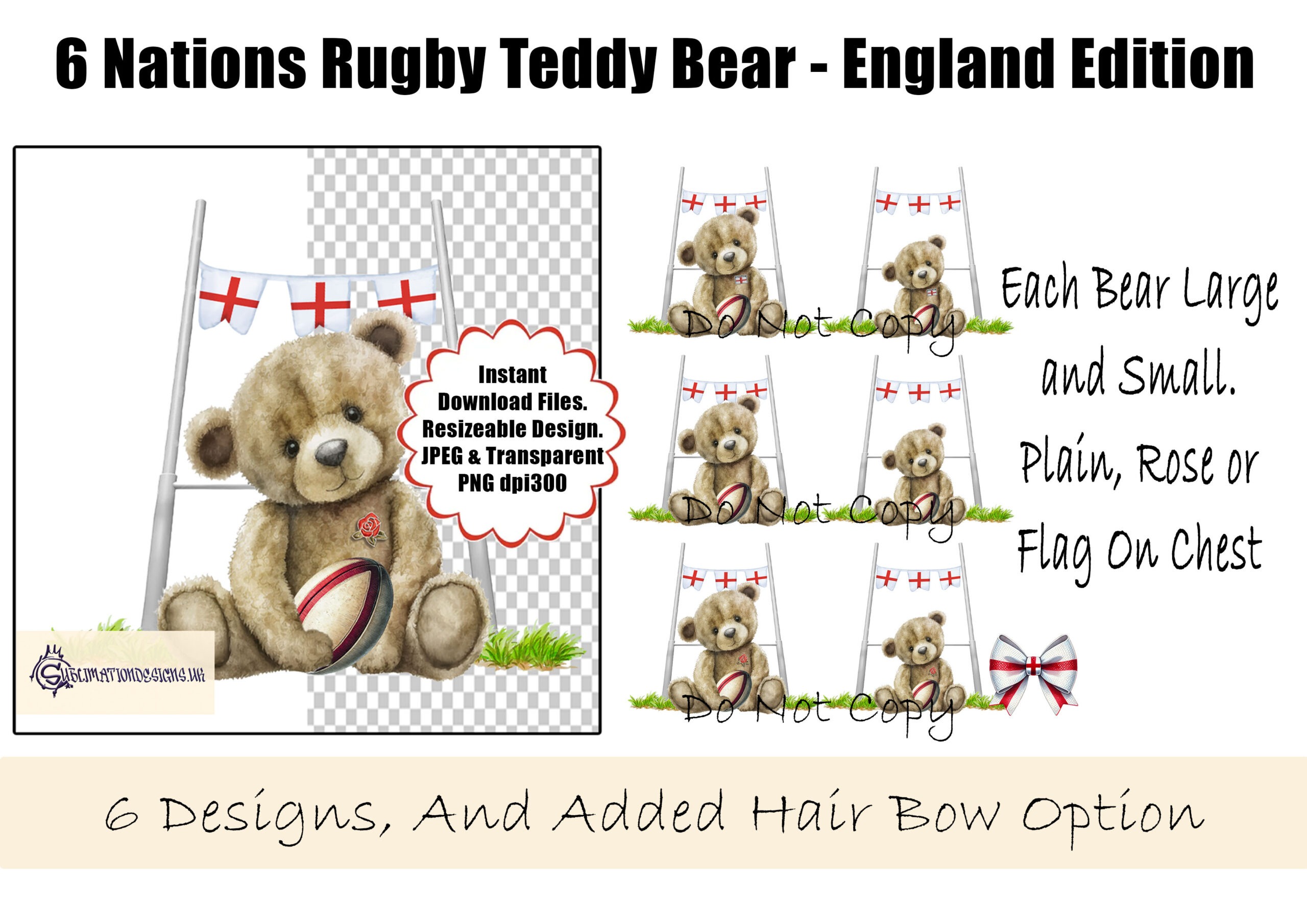 Celebrate your love for rugby with our Seated Teddy Bear 6 Nations Rugby Design – England Edition! This adorable collection features a teddy bear holding a rugby ball, seated below rugby posts adorned with Cross of St. George bunting. Perfect for patriotic rugby fans, each bear comes in two sizes under the posts and includes three variations: plain, with a rose patch, or with a flag patch on the chest, for a total of six designs. An optional hair bow is also included to add a touch of charm!