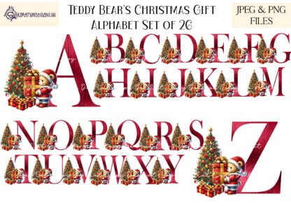 Celebrate the festive season with our charming Teddy Bears Christmas Gift Alphabet Set – Red Edition! This delightful collection features a full 26-letter alphabet, with each letter adorned with exclusive artwork of a teddy bear carrying a Christmas gift. Perfect for adding a personalized touch to your holiday decorations, crafts, and gift presentations, this set uses traditional red, green, and gold Christmas colours for a classic festive feel.