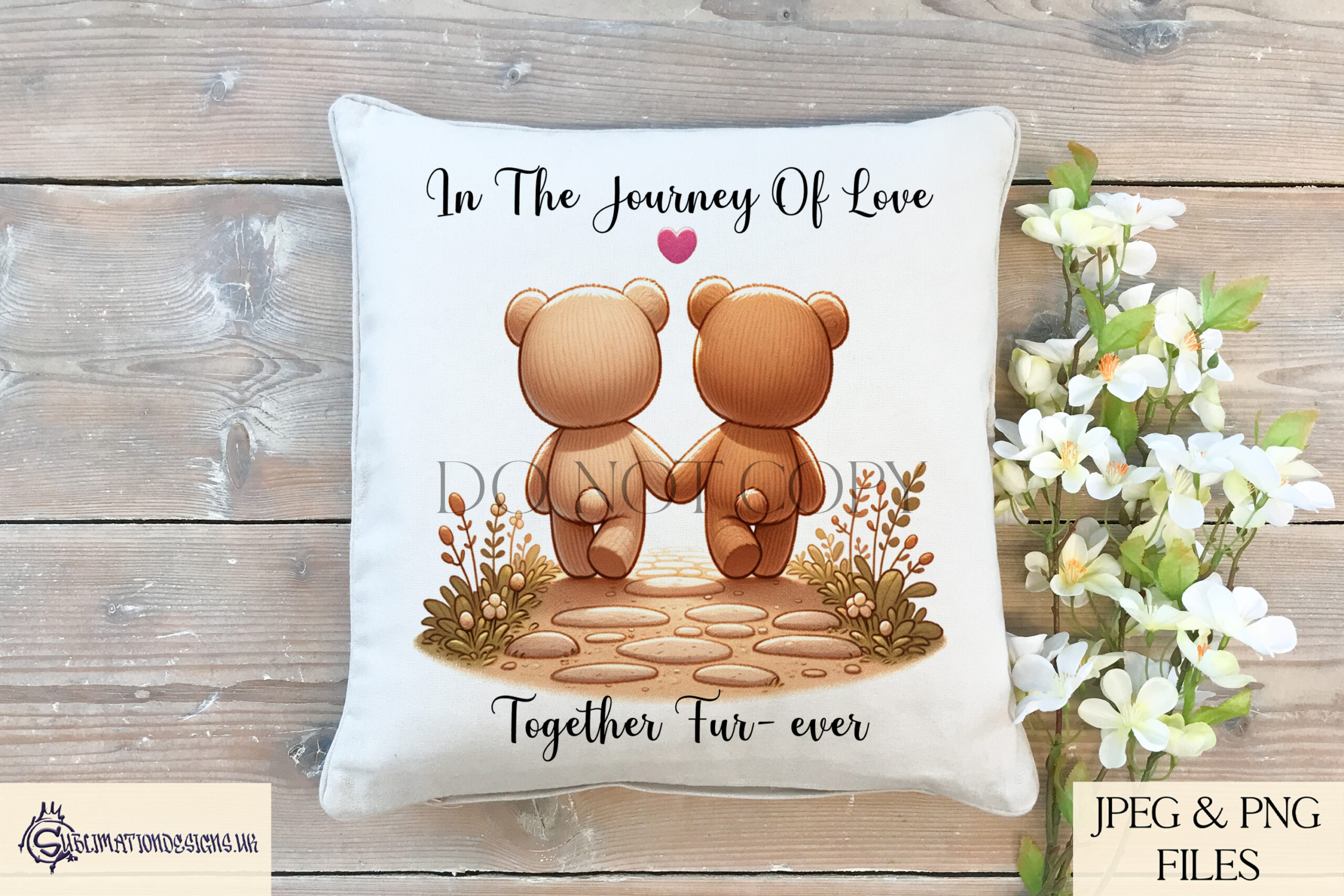 Celebrate the timeless journey of love with our Together Fur-Ever Teddy Bear Design Set. This charming set features two teddy bears in love walking down a path, evoking warmth and romance. With 3 unique designs, this collection includes a textless version, “I Will Love You Fur-Ever”, and “In the journey of love, Together Fur-Ever” wording options. Perfect for Valentine’s Day, anniversaries, or any occasion celebrating love, these versatile designs are ideal for sublimation and other crafting projects.