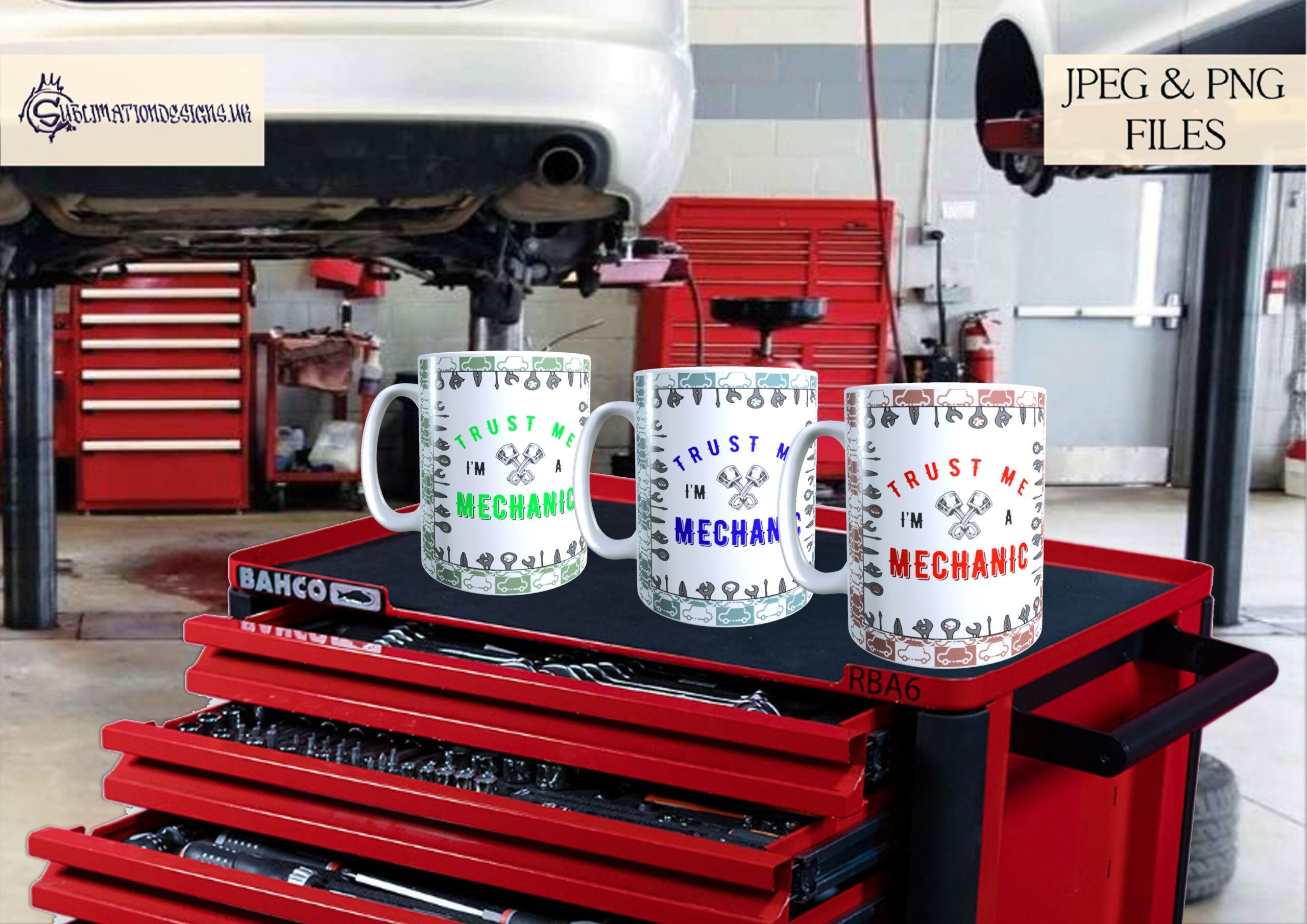 • 3 “Trust Me I’m A Mechanic” mug wraps (red, green and blue)