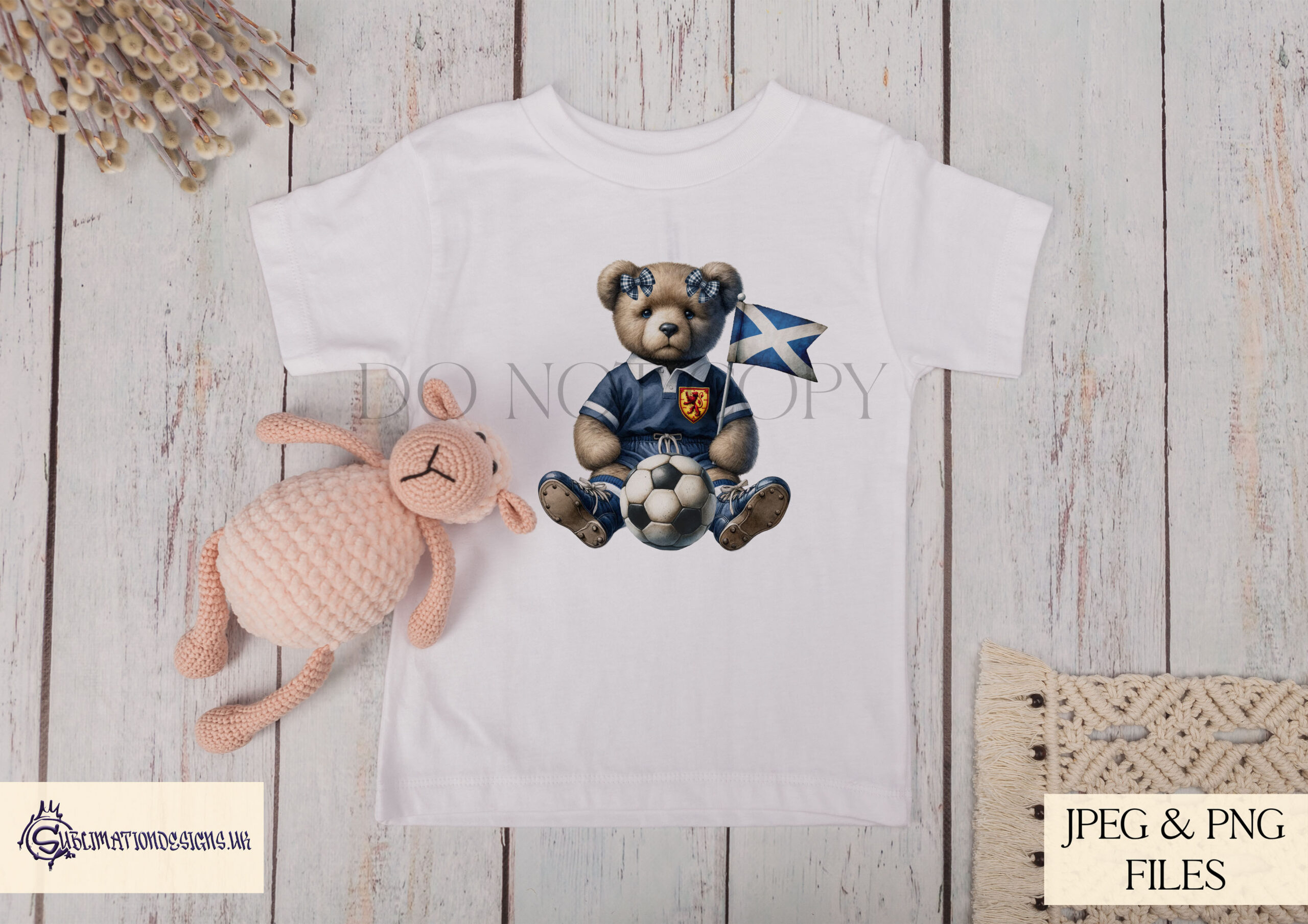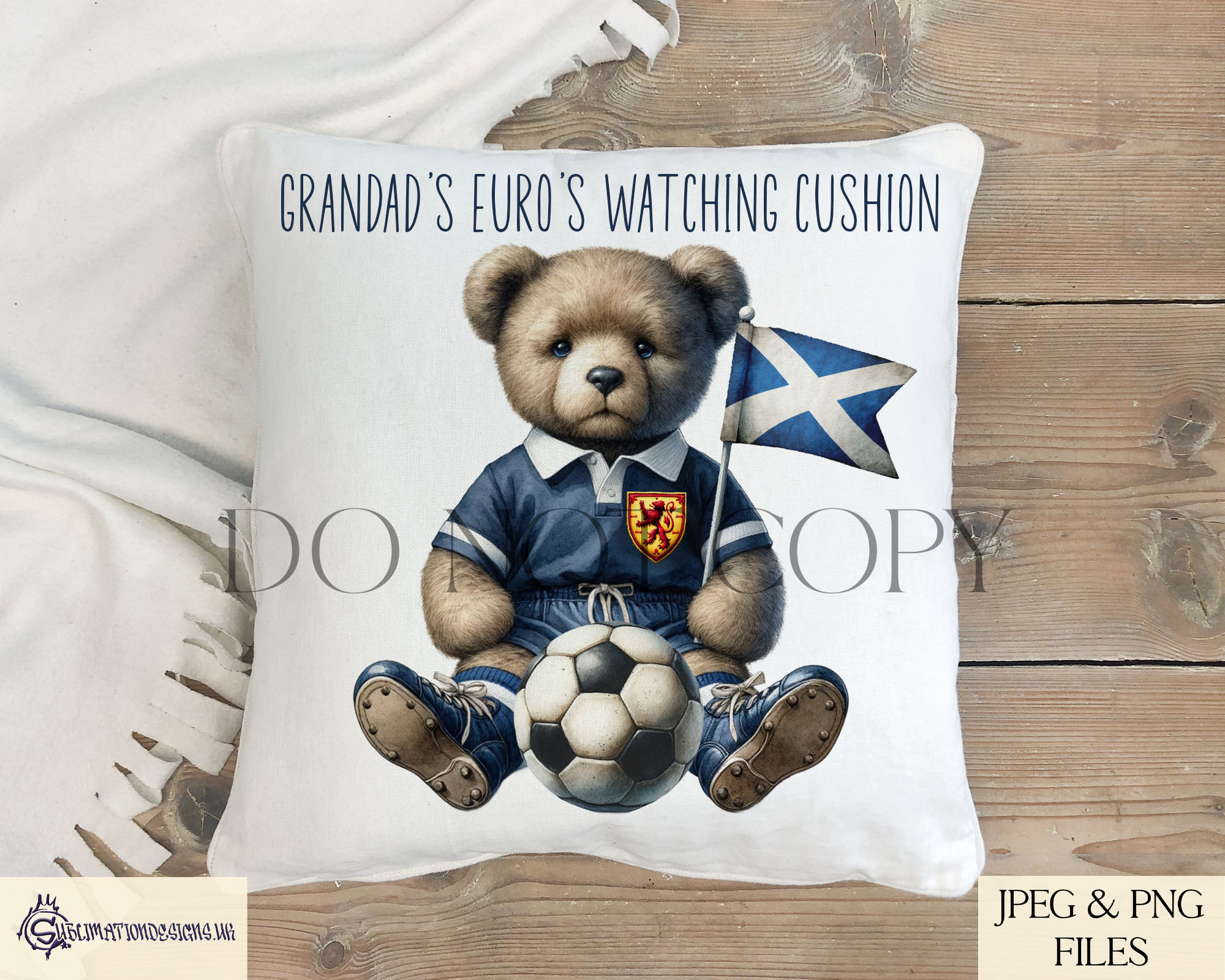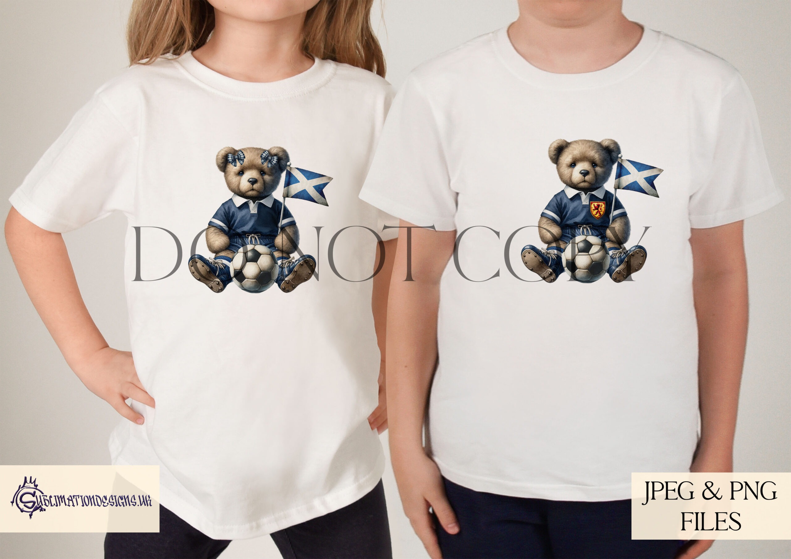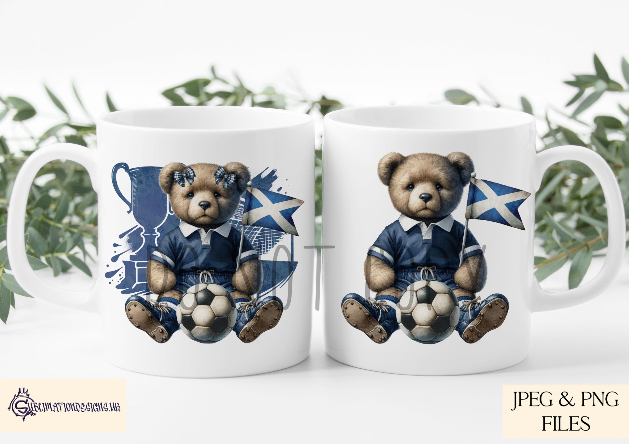 The bundle includes six variations. You receive a male and a female teddy bear design, each supplied with and without a Scottish inspired badge. You also receive versions with an optional background to give you more flexibility when creating products. All files are provided in JPEG and PNG at 300 DPI. These designs print clearly and work well on mugs, apparel, bottles and plaques. They also suit cushions, tins and many other football themed items. To help with your listings, the set includes four clean mock ups.