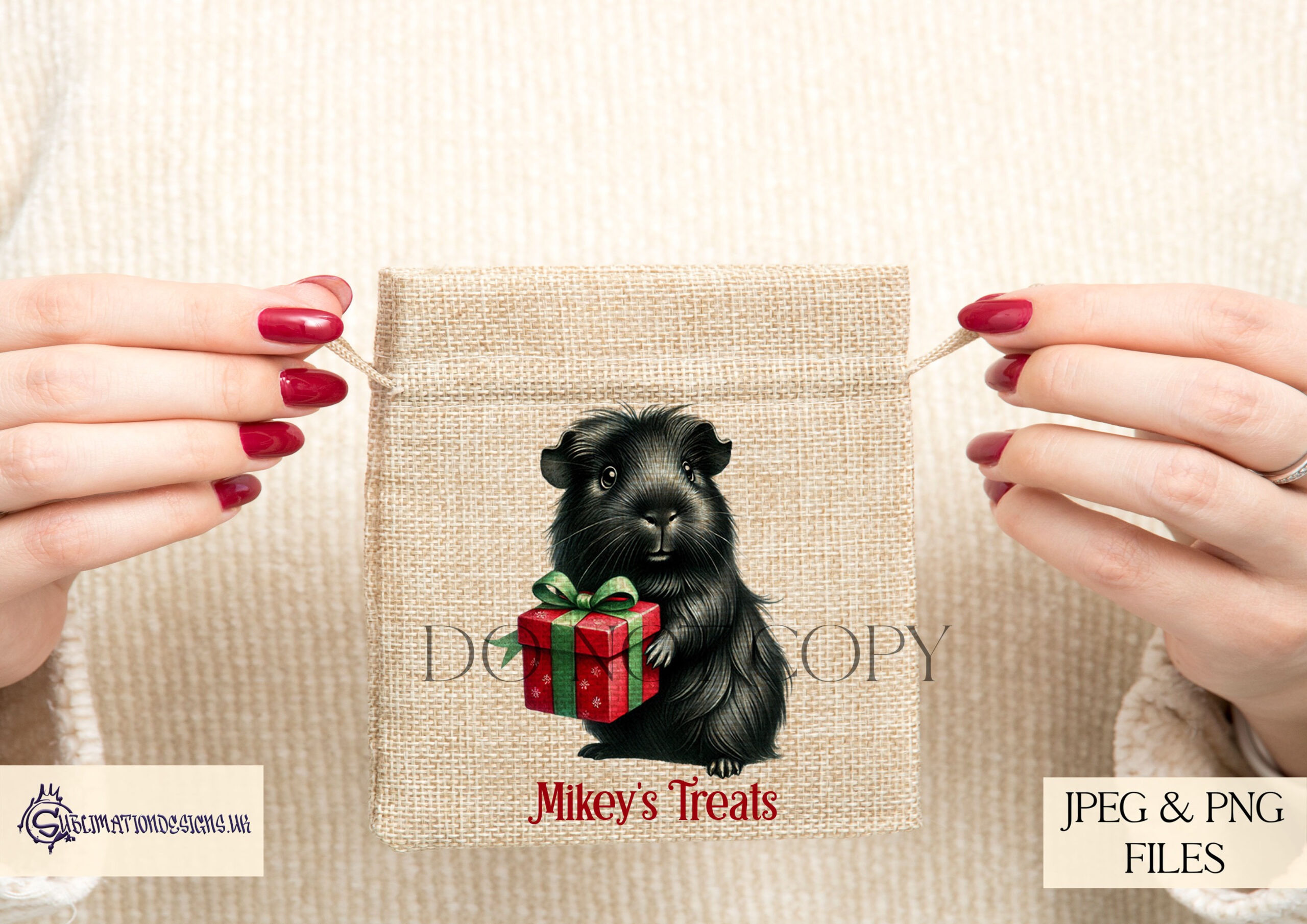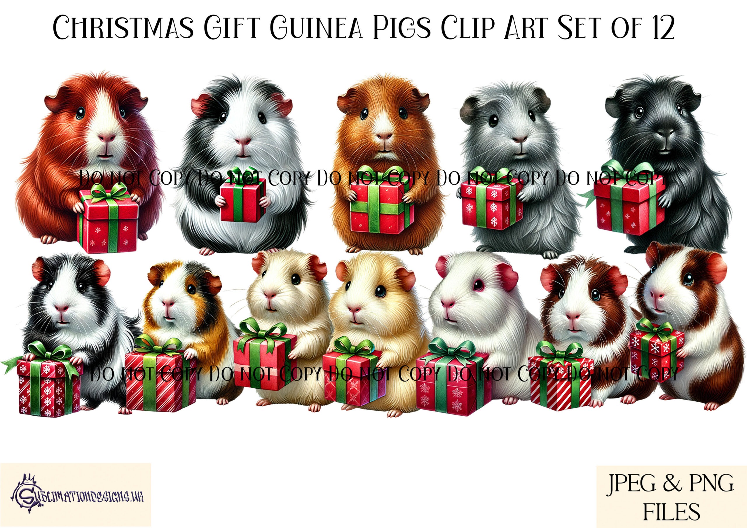 Celebrate the holiday season with our charming Water coloured Guinea Pigs with Christmas Gifts Clip Art Set! This delightful collection features 12 unique guinea pig illustrations in a variety of colours, each holding festive gifts. Perfect for creating personalised Christmas products like gift sacks, baubles, and more, this set is a must-have for guinea pig lovers. These designs are ideal for use on physical products and can also be incorporated into your own creative projects.