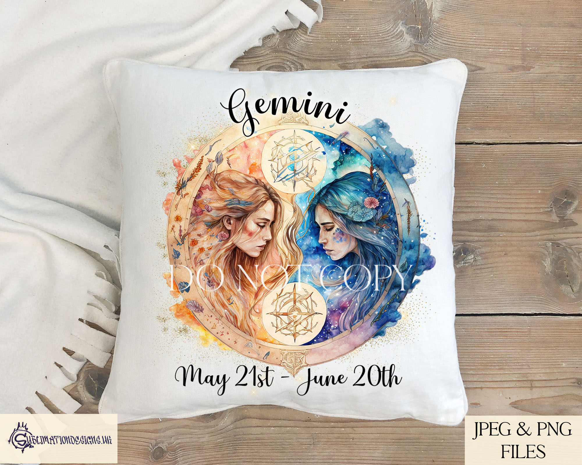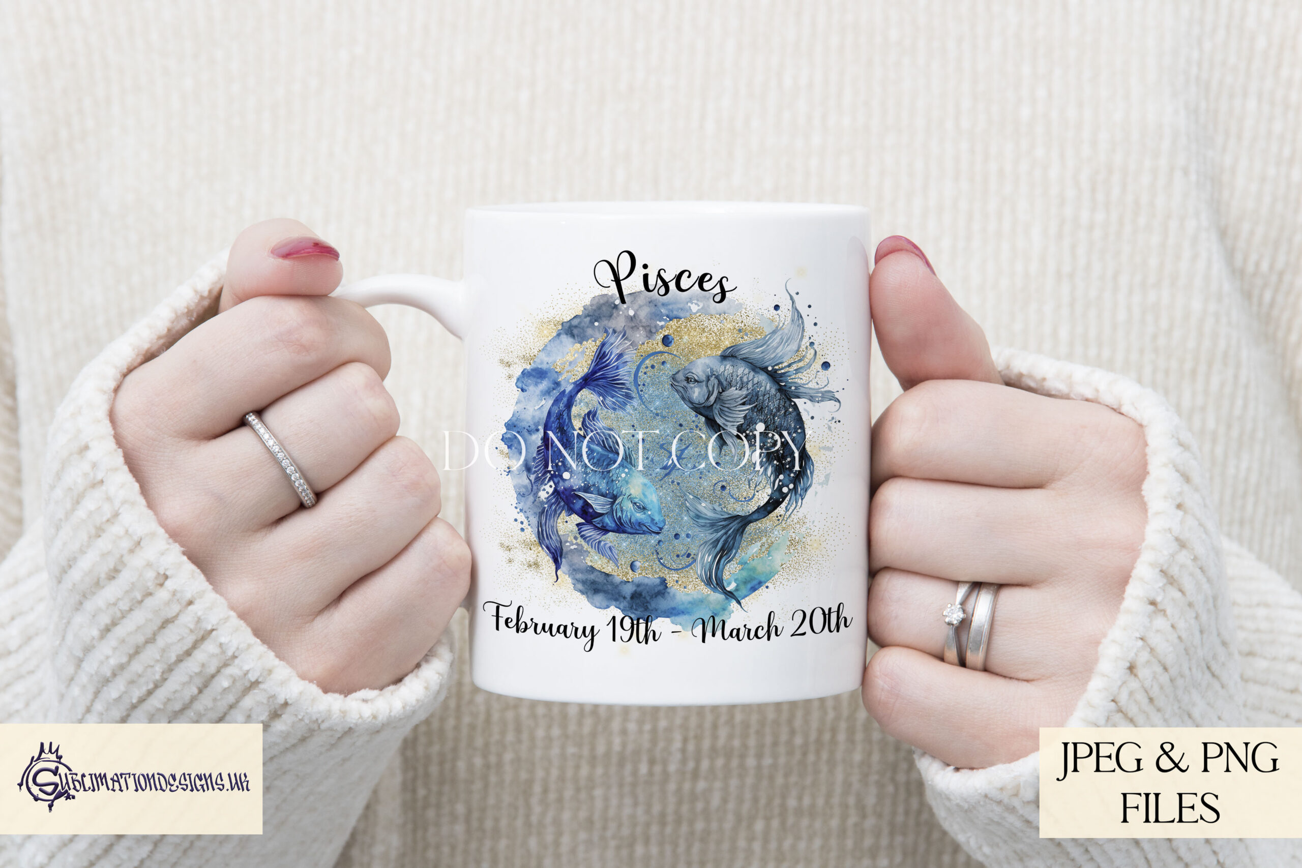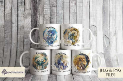 A Watercoloured zodiac design set featuring all 12 star signs with glitzy detailing, names and date ranges included. Perfect for astrology lovers and celestial-themed projects. Comes in JPEG and PNG format with 6 mock-ups and a commercial licence for up to 500 physical products.