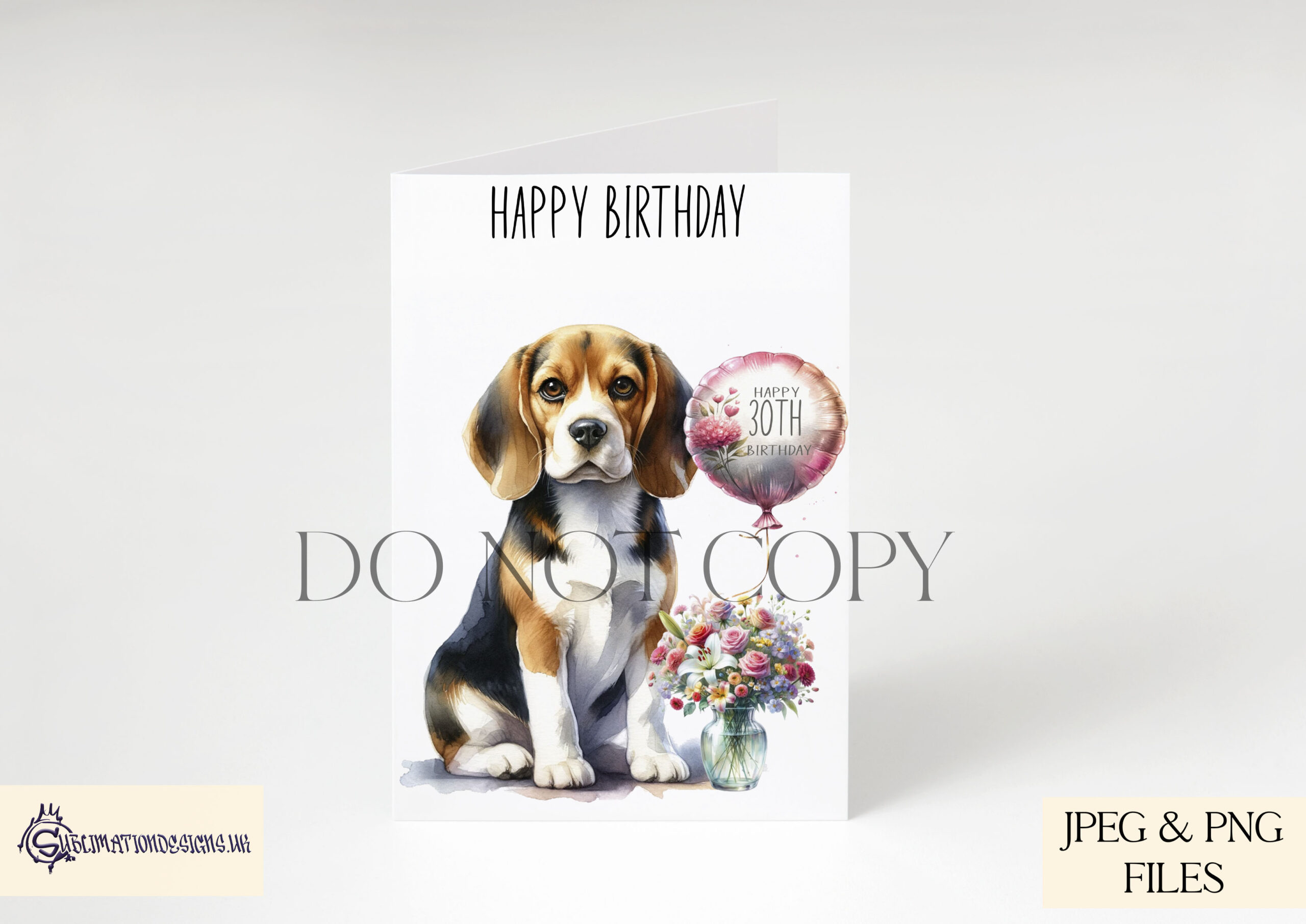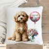 - Each design showcases a dog sitting beside a vase of flowers and a textless balloon, ready for customization.