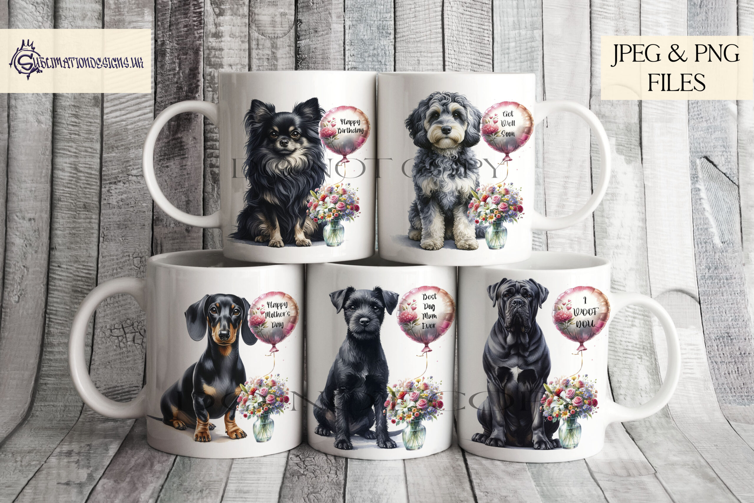 Celebrate special moments with our Well Wishing Dog Bundle, a versatile collection of over 100 designs featuring adorable dogs alongside a bouquet of flowers in a vase and a textless balloon. This bundle is perfect for creating heartfelt gifts for Mother’s Day, birthdays, get well soon wishes, retirements, and more.