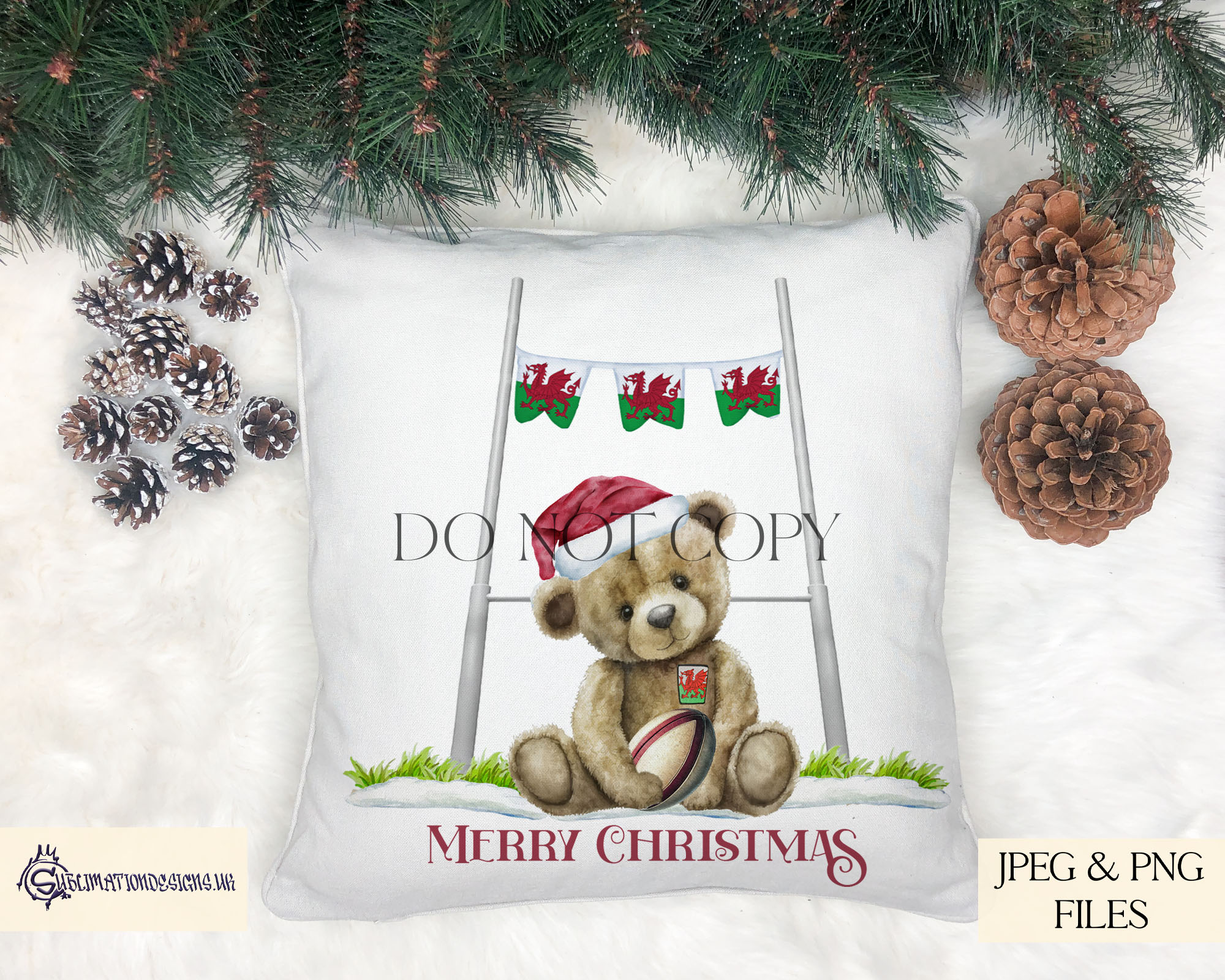 Celebrate the festive season with our Welsh Rugby Christmas Bear Set of 3. Features a rugby bear in a Santa hat under the goalposts with textless, Merry Christmas and Nadolig Llawen wording options. Supplied in JPEG and PNG formats with 3 mock-ups and a 500-use licence. Perfect for Welsh rugby fans and only £2.99.