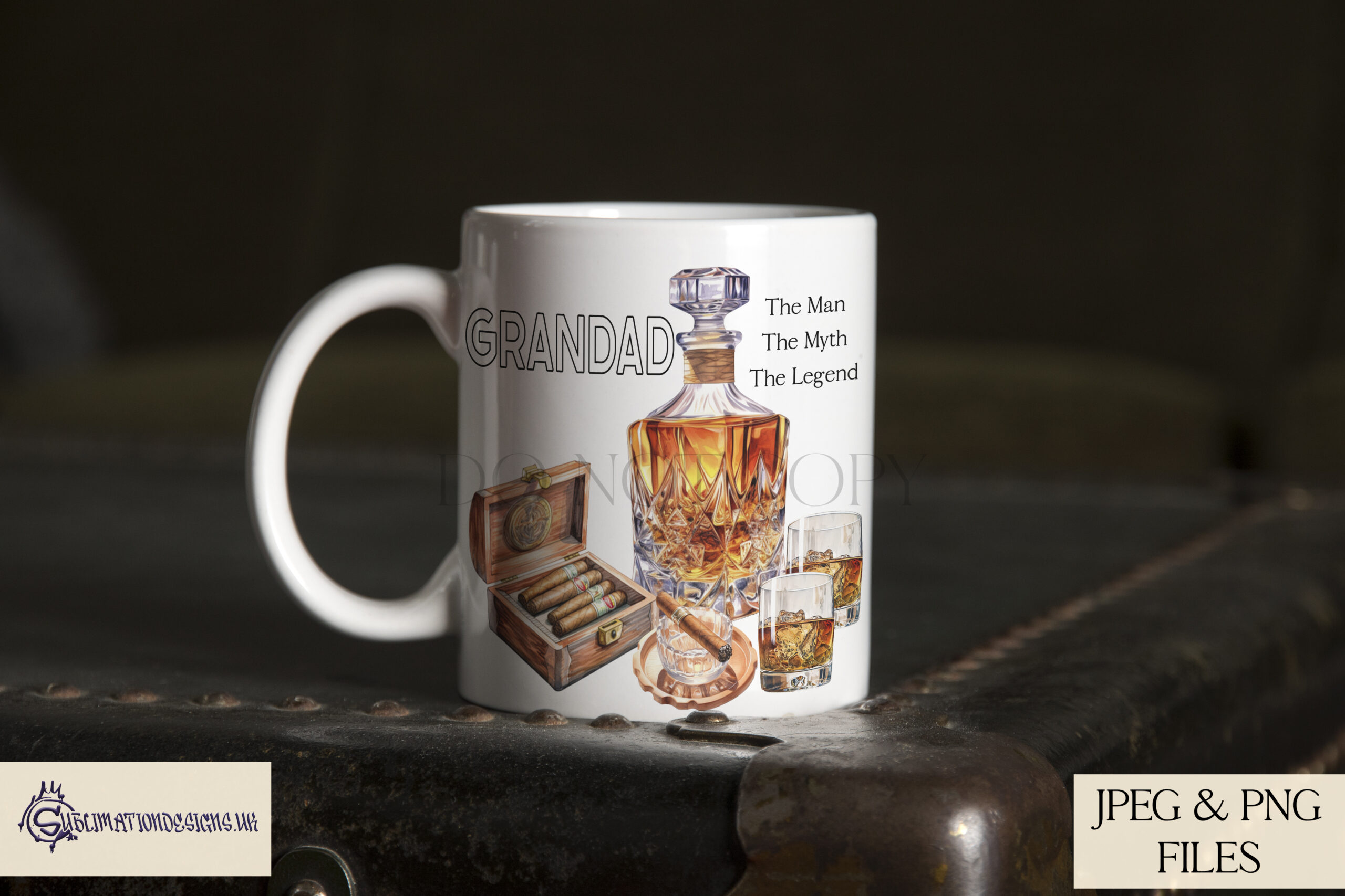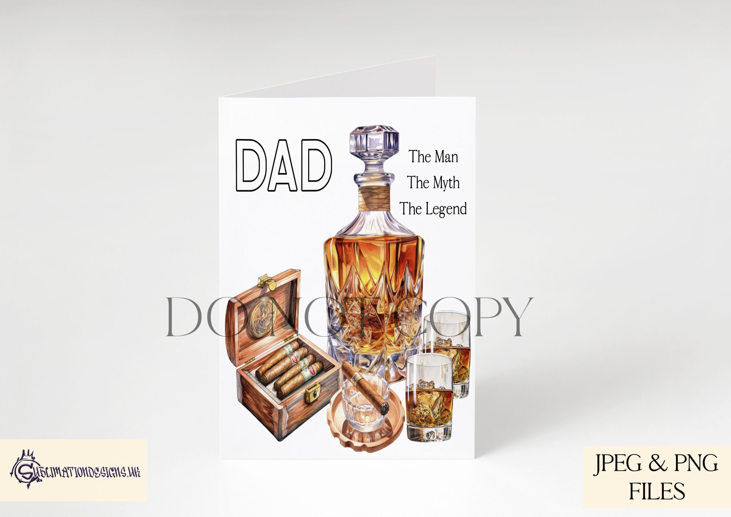 A refined design set featuring a whiskey decanter, glasses, cigars and humidor in 5 elegant layouts. Includes versions for Dad, Daddy, Grandad and “The Man, The Myth, The Legend,” plus a textless option. Supplied in JPEG and PNG format with 3 mock-ups and a commercial licence for up to 500 physical products.