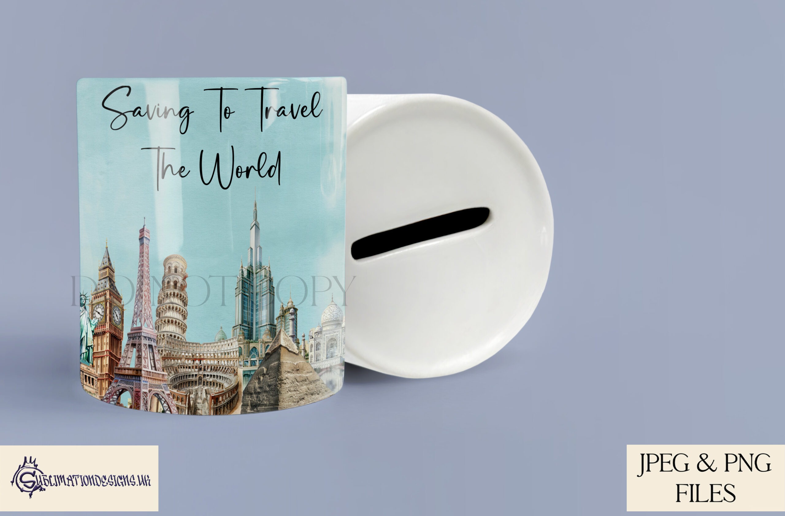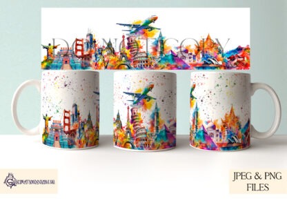 Explore global creativity with 8 landmark mug wraps, featuring watercolour and vibrant designs. Includes background and plane variations. JPEG & PNG formats, 5 mock-ups, and a 500-product commercial licence.